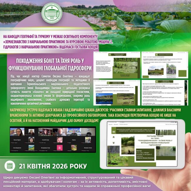 НА КАФЕДРІ ГЕОГРАФІЇ ТА ТУРИЗМУ ВІДБУЛАСЯ ГОСТЬОВА ЛЕКЦІЯ «ПОХОДЖЕННЯ БОЛІТ ТА ЇХНЯ РОЛЬ У ФУНКЦІОНУВАННІ ГЛОБАЛЬНОЇ ГІДРОСФЕРИ»