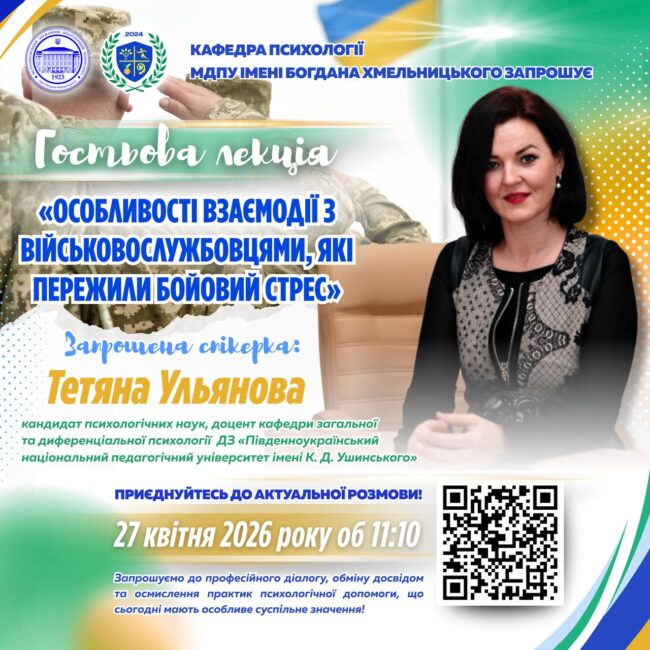 🏛 Кафедра психології МДПУ імені Богдана Хмельницького запрошує здобувачів освіти, викладачів, практичних психологів та всіх зацікавлених долучитися до гостьової лекції, присвяченої надзвичайно актуальній темі психологічної підтримки та професійної взаємодії з військовослужбовцями, які пережили бойовий стрес – “Особливості взаємодії з військовослужбовцями, які пережили бойовий стрес”. 🪖 У сучасних реаліях ця проблематика набуває особливої ваги, адже фахове…