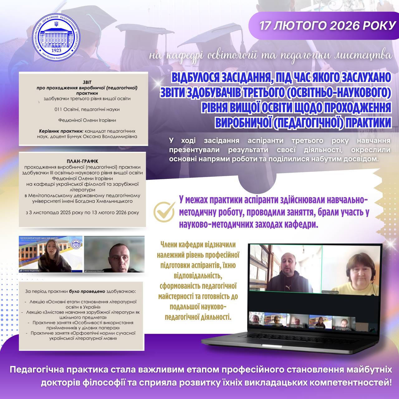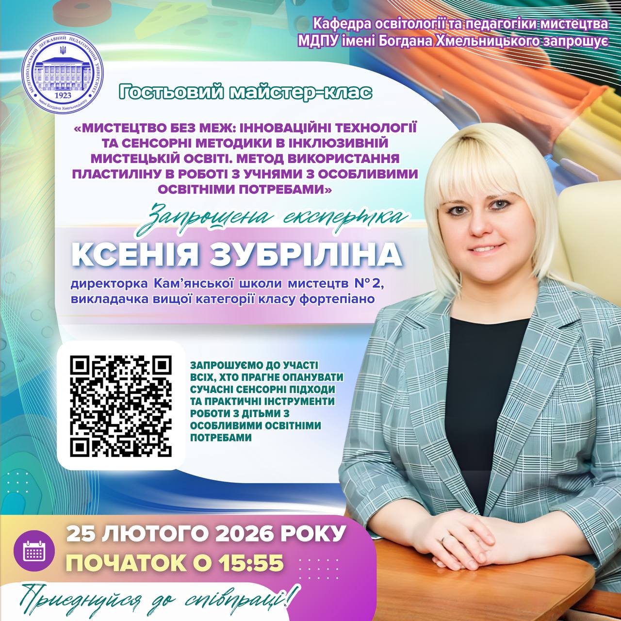 🎓 Кафедра освітології та педагогіки мистецтва запрошує на гостьовий майстер-клас, який відбудеться 25 лютого 2026 року о 15:55 у межах підготовки здобувачів і здобувачок спеціальності А4.13 Середня освіта (Мистецтво. Музичне мистецтво). 🖌 Тема зустрічі: «Мистецтво без меж: інноваційні технології та сенсорні методики в інклюзивній мистецькій освіті. Метод використання пластиліну в роботі з учнями з особливими […]