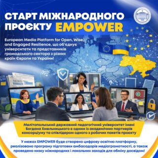 🧠📲 Проєкт EMPOWER спрямований на розвиток медіаграмотності та цифрової стійкості громадян. Його мета — сприяти формуванню навичок критичного сприйняття цифрової інформації, розпізнавання дезінформації та безпечної навігації в сучасному медіапросторі.