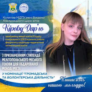 📝📌 Згідно з розпорядженням Мелітопольського міського голови від 24.02.2026 № 16-р «Про затвердження списку молоді, якій призначена стипендія Мелітопольського міського голови для обдарованої молоді міста» відзначено активну громадянську позицію Дар’ї, її послідовну волонтерську діяльність та вагомий внесок у розвиток соціальної підтримки громади.