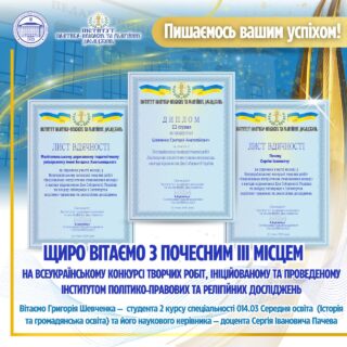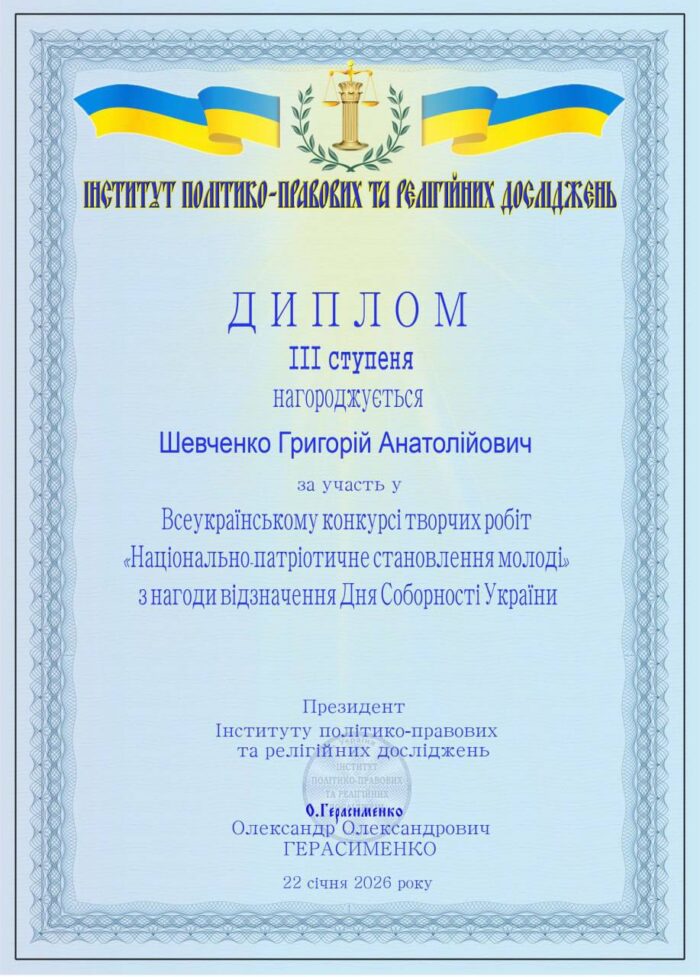 👥🥳 Колектив Мелітопольського державного педагогічного університету імені Богдана Хмельницького щиро вітає студента 2 курсу спеціальності 014.03 Середня освіта (Історія та громадянська освіта) 🥉👏🏻ГРИГОРІЯ ШЕВЧЕНКА з почесним ІІІ місцем у Всеукраїнському конкурсі творчих робіт «Національно-патріотичне становлення молоді», присвяченому Дню Соборності України.