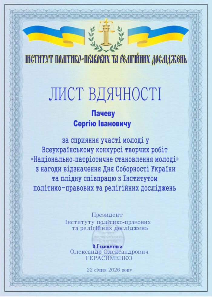 💐👨🏼‍🎓 Окремі слова вдячності висловлюємо наставнику переможця — Пачеву Сергію Івановичу, кандидату історичних наук, доценту, завідувачу кафедри історії та археології, за професійний супровід, підтримку студентської молоді та вагомий внесок у формування національно свідомих фахівців.