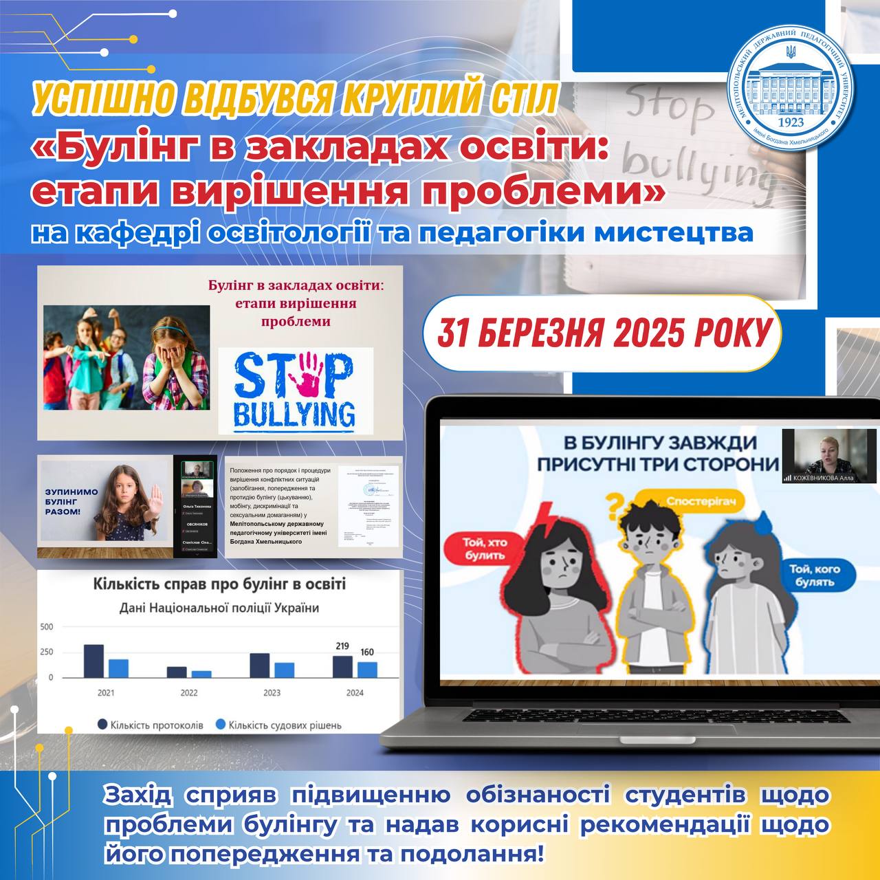 🏛️💫 31 березня 2025 року відбувся круглий стіл на тему «Булінг в закладах освіти: етапи вирішення проблеми»,відповідно до плану роботи Центру недискримінації, організований викладачем кафедри освітології та педагогіки мистецтва Кожевниковою А.В. 👥‼️У заході взяли участь здобувачі І-ІІ рівнів вищої освіти нашого університету. 📝✊🏻Під час дискусії учасники обговорили:💡Основні причини та наслідки булінгу в освітніх закладах.💡 Законодавчі […]