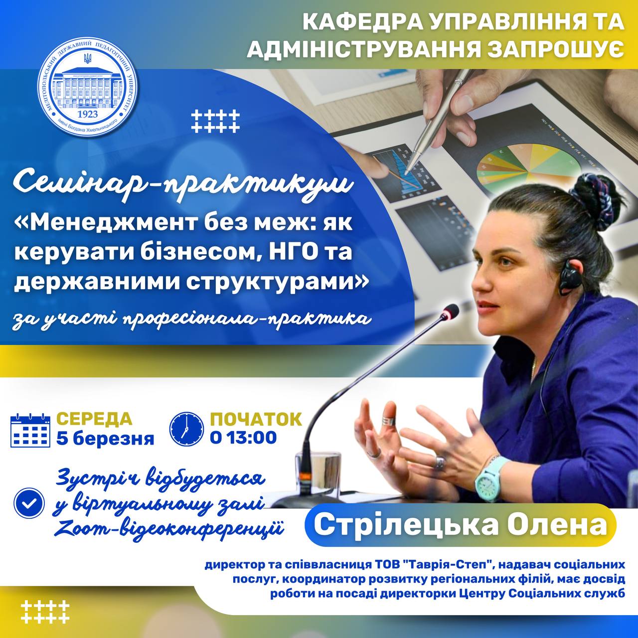 🏛️⭐️Кафедра управління та адміністрування МДПУ імені Богдана Хмельницького запрошує на семінар-практикум: «Менеджмент без меж: як керувати бізнесом, НГО та державними структурами». 👩🏼💼💫Семінар-практикум проведе Стрілецька Олена – директор та співвласниця ТОВ “Таврія-Степ”, надавач соціальних послуг, координатор розвитку регіональних філій, має досвід роботи на посаді директорки Центру Соціальних служб ✅📆Долучайтеся 5 березня 2025 року о 13:00 за […]