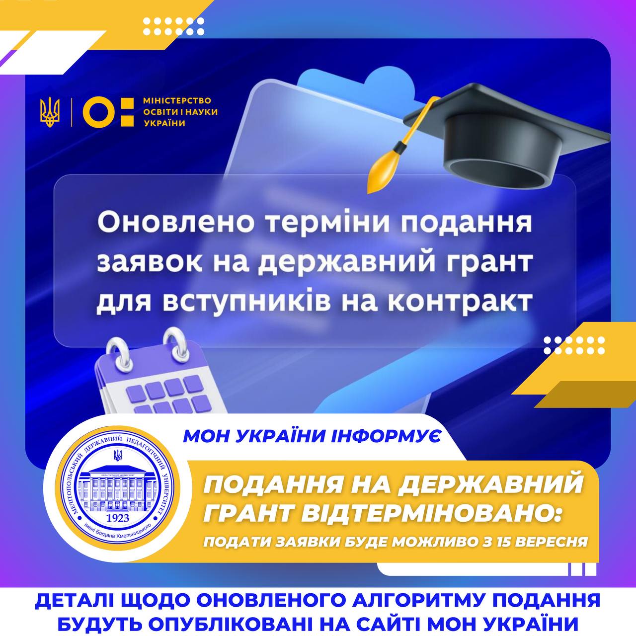🏛️➡️Про це йдеться на сайті https://mon.gov.ua/news/onovlennia-terminiv-podannia-zaiavok-na-derzhavnyi-hrant-dlia-vstupnykiv-na-kontrakt ✅👨🏻🎓Міністерство освіти і науки України інформує, що подання на державний грант відтерміновано. Подати заявки буде можливо орієнтовно з 15 вересня 2024 року (дату та час буде оголошено окремо). Це пов’язано зі змінами, які найближчий часом будуть внесені до Постанови про реалізацію експериментального проєкту щодо надання державних грантів на здобуття […]