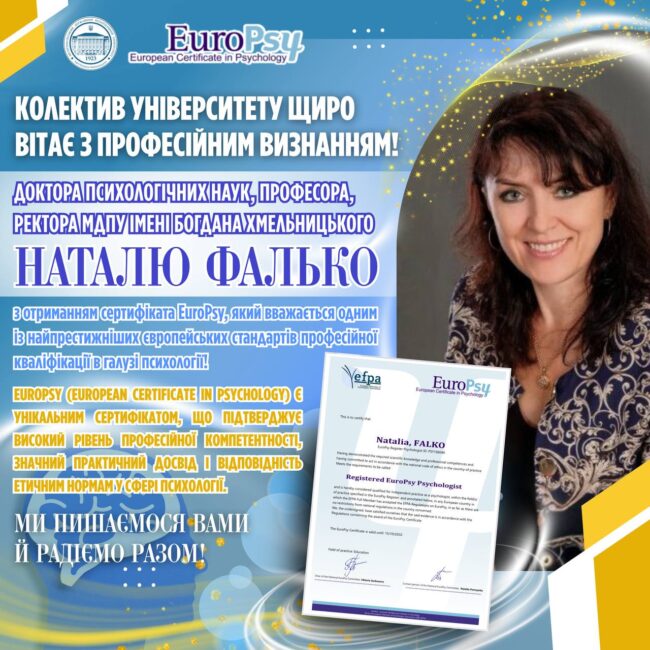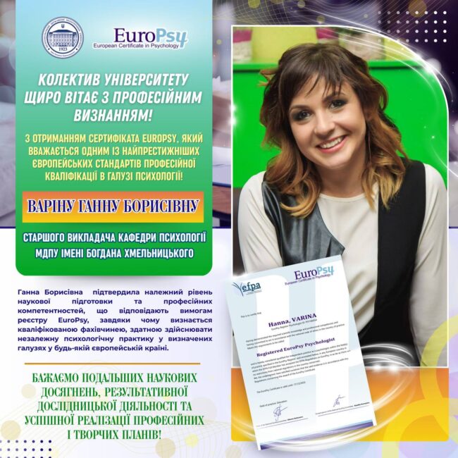 🎓💫 Колектив Мелітопольського державного педагогічного університету імені Богдана Хмельницького щиро вітаєВаріну Ганну Борисівну,старшого викладача кафедри психології, з отриманням сертифіката EuroPsy та внесенням до Європейського реєстру психологів! 🌍🧠 Це визнання є переконливим свідченням високого рівня професійної підготовки, наукової відповідальності та практичної зрілості фахівця, який працює відповідно до найкращих європейських стандартів психологічної освіти й практики. 🖼✅ Сертифікат…