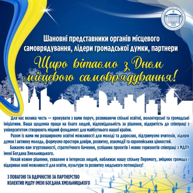 👩🏼💼🤝🏻 Шановні представники органів місцевого самоврядування, дорогі партнери! Щиро вітаємо вас із Днем місцевого самоврядування! 🗣️✅ Ви — опора громад, голос людей і сила щоденних змін. Саме завдяки вашій відповідальності, згуртованості та далекоглядності народжується розвиток, тримається стійкість і зростає довіра. 🎓👏🏻МДПУ імені Богдана Хмельницького високо цінує наше партнерство та спільну працю заради освіти, молоді й…