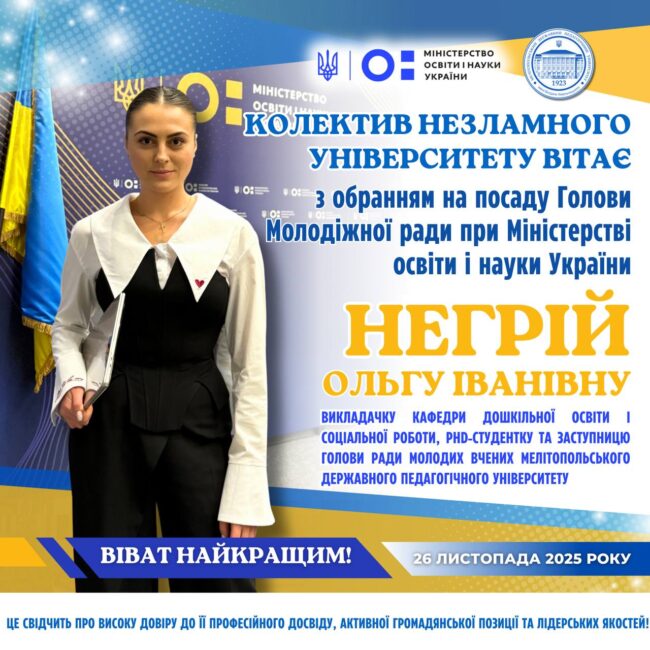 🎓⭐️ Колектив Мелітопольського державного педагогічного університету щиро вітає Ольгу Іванівну Негрій з обранням Головою Молодіжної ради при Міністерстві освіти і науки України! 🏛🗣 26 листопада 2025 року відбулося перше засідання новоствореної Молодіжної ради при МОН України. 👩🏼🎓💬Рішенням більшості голосів Головою Молодіжної ради було обрано Ольгу Іванівну Негрій — викладачку кафедри дошкільної освіти і соціальної роботи,…