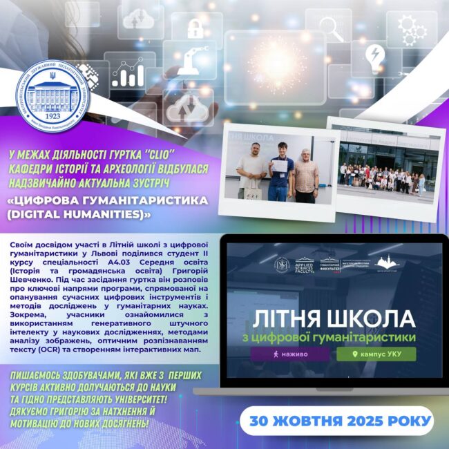 ✅🧑🏼🎓 Минулого четверга, 30 жовтня, відбулося чергове засідання наукового студентського гуртка “Clio” кафедри історії та археології. Цього разу зустріч була присвячена обговоренню надзвичайно актуальної теми — цифрової гуманітаристики (Digital Humanities). 🤝🏻📚 Своїм досвідом участі в Літній школі з цифрової гуманітаристики у Львові поділився студент 2 курсу (спеціальність 014.03 Середня освіта (Історія та громадянська освіта) Григорій…