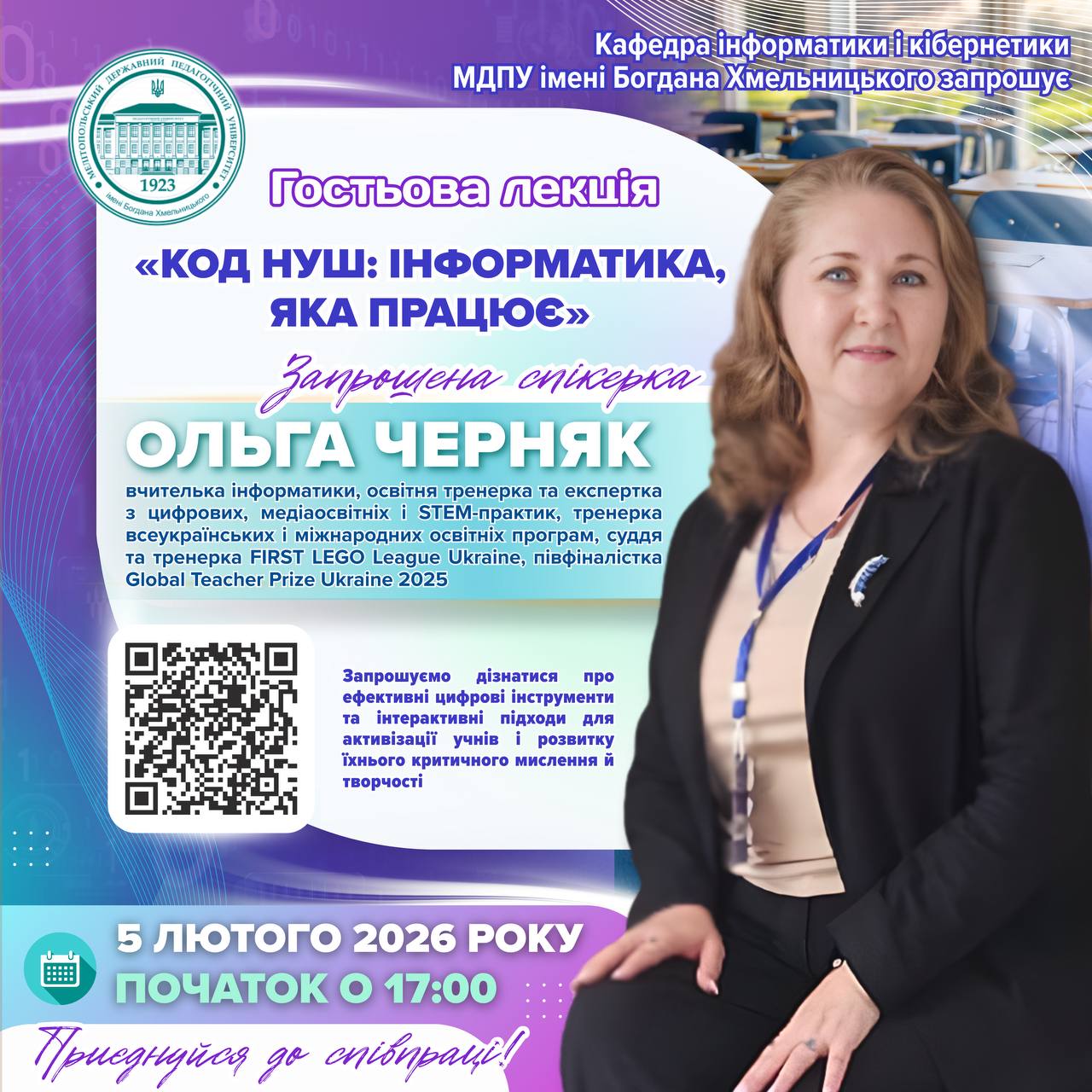 🎓‼️ Кафедра інформатики і кібернетики запрошує здобувачів освіти, викладачів та всіх зацікавлених на гостьову лекцію-тренінг «Код НУШ: інформатика, яка працює»! 👩🏼🎓📌 Запрошений спікер: Ольга Черняк — вчителька інформатики НВК №148 “Планета Щастя” Дніпровської МР, тренерка проєкту “Вивчаю не чекаю”, “Всеукраїнська школа онлайн: Впровадження 2025. Практичні аспекти.” та курсу “ДІЗНація: про дистанційне та змішане навчання” (ГС […]