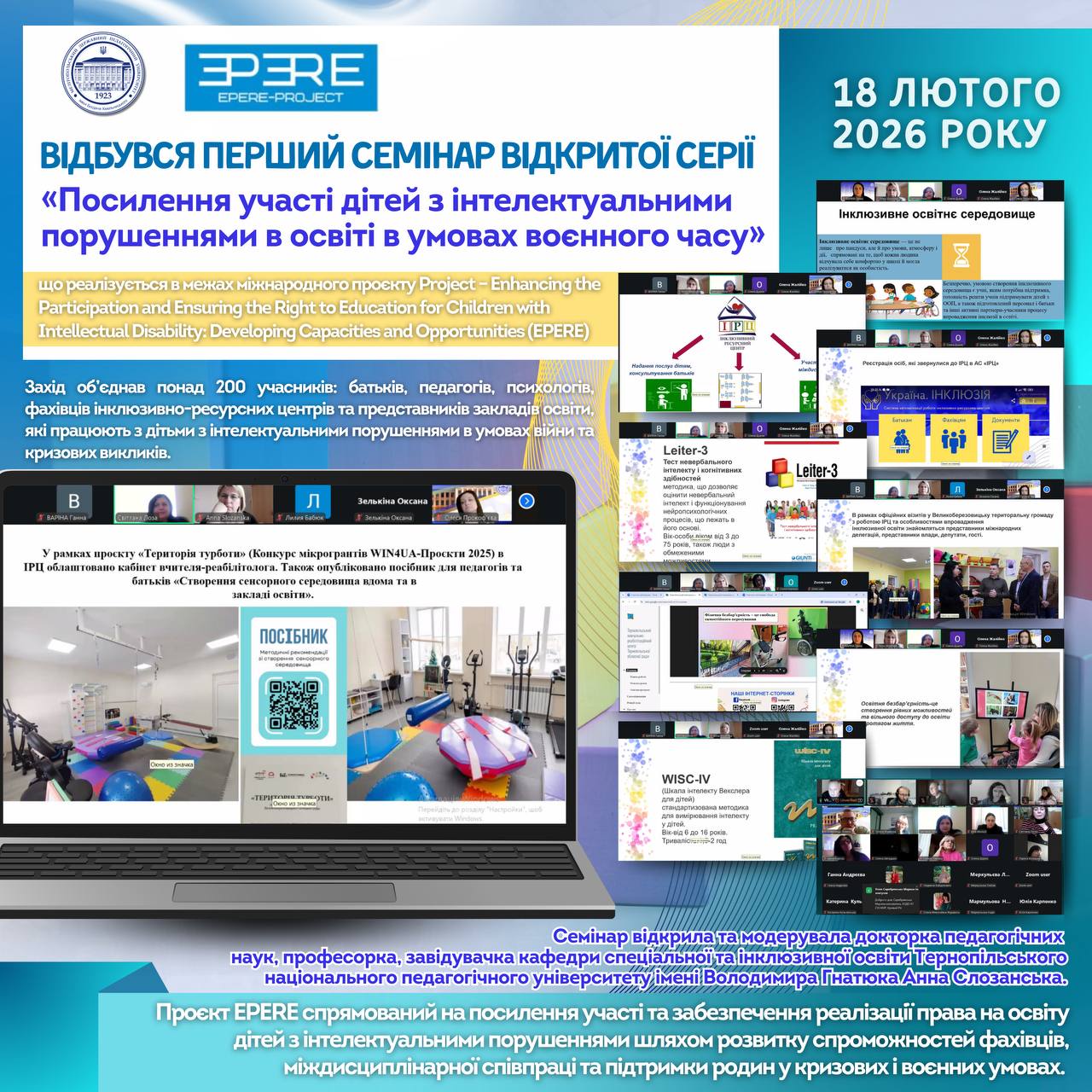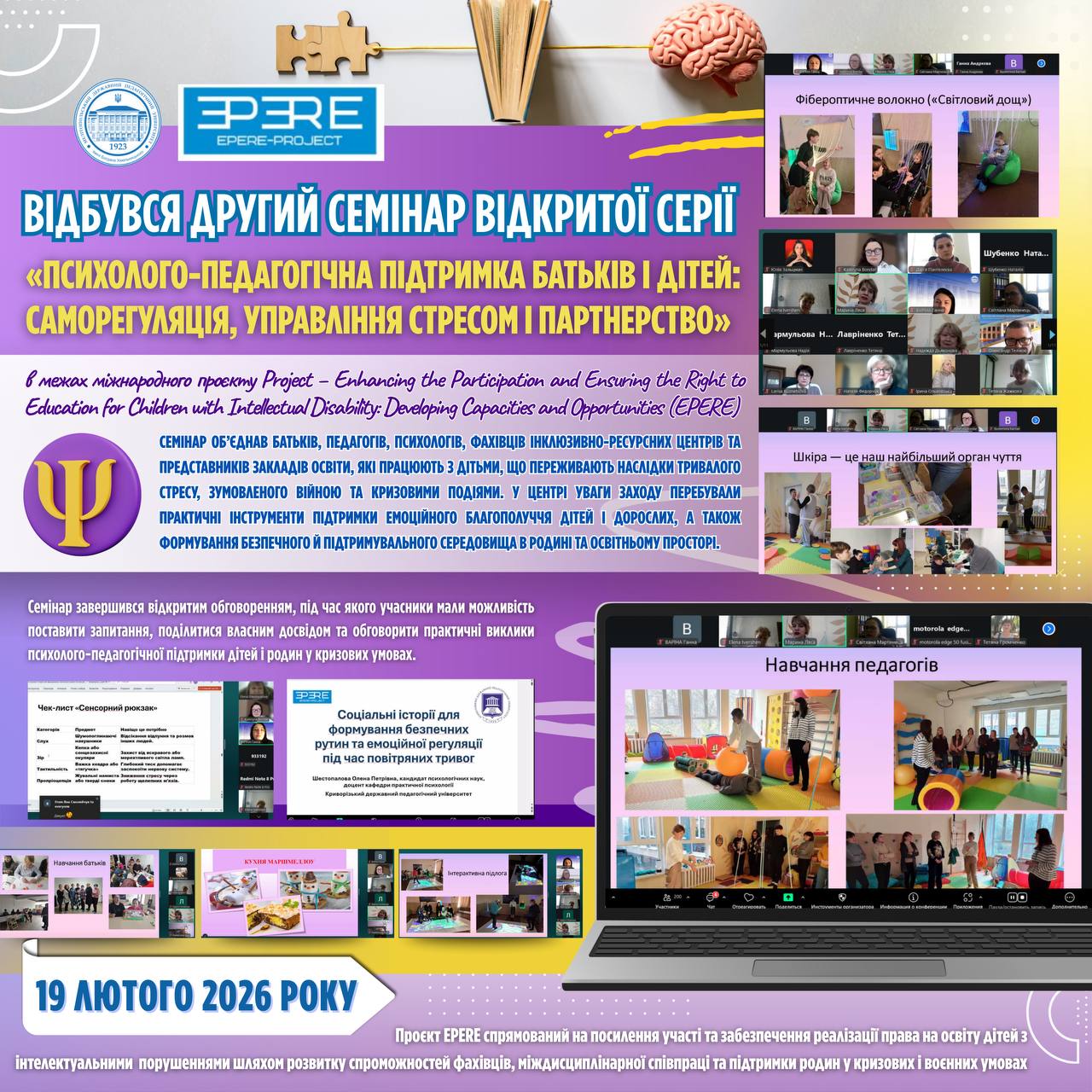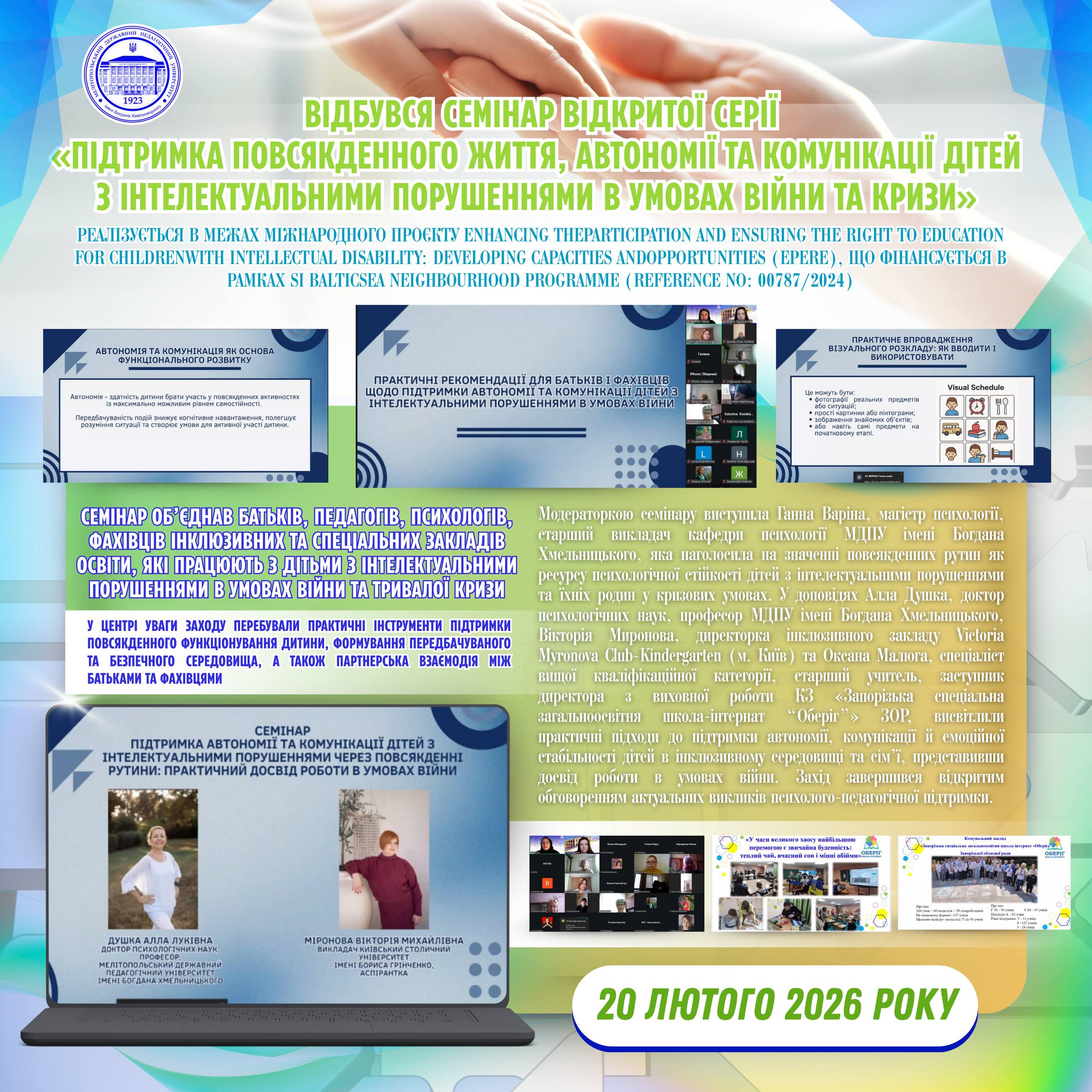 🗓 20 лютого 2026 року в онлайн-форматі відбувся семінар відкритої серії «Підтримка повсякденного життя, автономії та комунікації дітей з інтелектуальними порушеннями в умовах війни та кризи», який реалізується в межах міжнародного проєкту Enhancing the Participation and Ensuring the Right to Education for Children with Intellectual Disability: Developing Capacities and Opportunities (EPERE), що фінансується в рамках […]