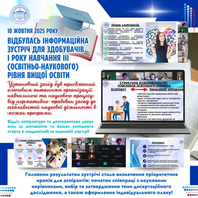 👩🏻💻‼️10 жовтня 2025 року відділ аспірантури та докторантури, в особі завідувачки Олени Долинної, провів інформаційну зустріч для здобувачів І року навчання ІІІ (освітньо-наукового) рівня вищої освіти. ✅⭐️Це була друга зустріч із серії, присвяченої адаптації першокурсників, першу з яких провела директор Центру освітніх дистанційних технологій Альона Чорна, ознайомивши здобувачів з роботою дистанційної платформи для навчання. 👩🏼🎓📌Установчий…