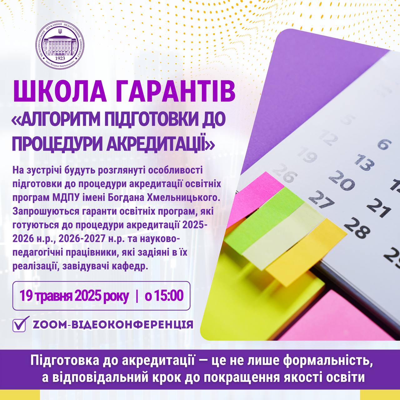 👩🏻💻📚 Запрошуємо гарантів освітніх програм на черговий семінар ШКОЛИ ГАРАНТІВ «Алгоритм підготовки до процедури акредитації»! 📊⭐️ На зустрічі будуть розглянуті особливості підготовки до процедури акредитації освітніх програм. 👩🏻🎓‼️ Запрошуються гаранти освітніх програм, які готуються до процедури акредитації 2025-2026 н.р., 2026-2027 н.р. та науково-педагогічні працівники, які задіяні в їх реалізації, завідувачі кафедр. 📆📌Семінар відбудеться 19 травня […]