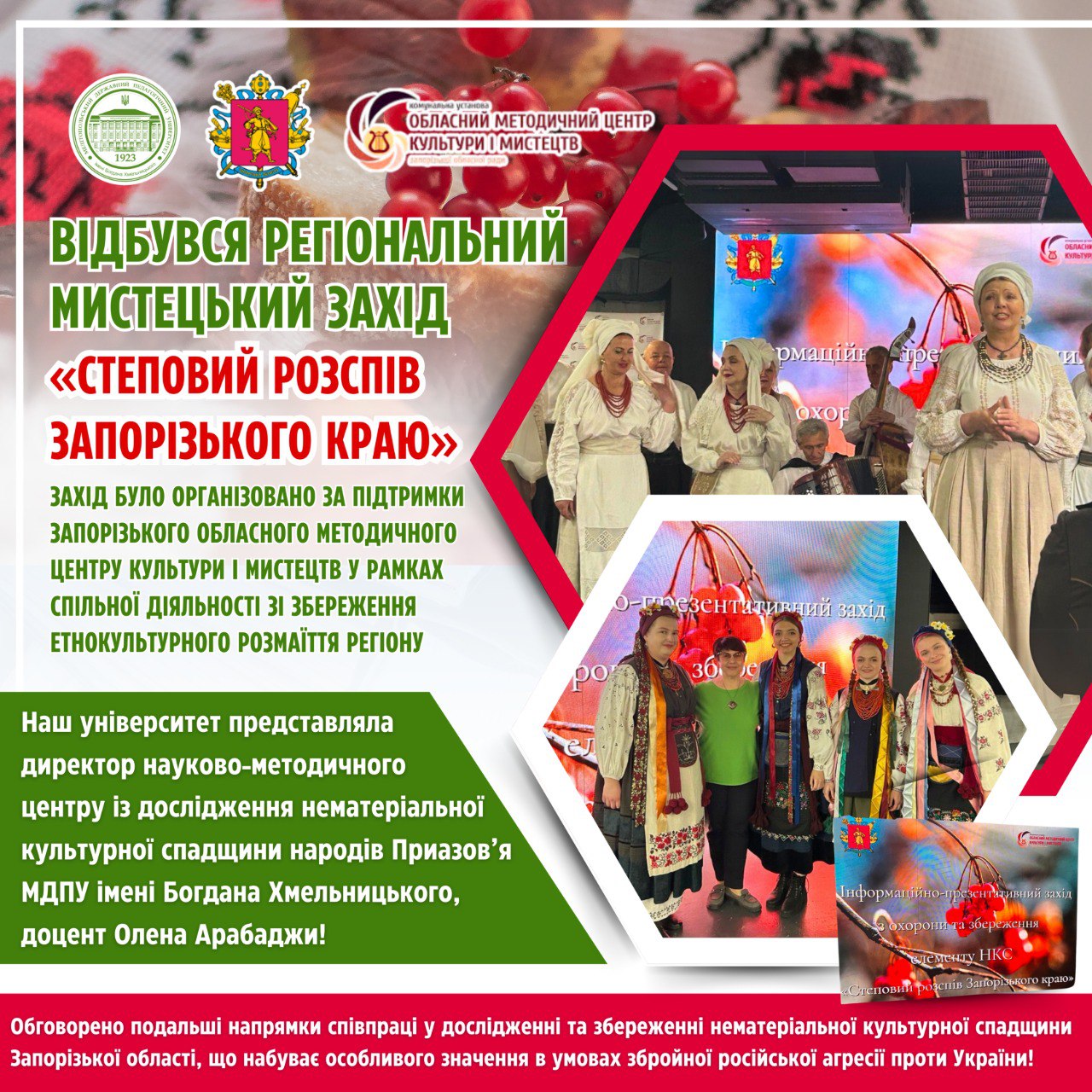 👩🏻🎓🏛️ 27 квітня 2025 року директор науково-методичного центру із дослідження нематеріальної культурної спадщини народів Приазов’я МДПУ імені Богдана Хмельницького, доцент Олена Арабаджи, взяла участь у регіональному мистецькому заході, присвяченому охороні та збереженню елементу “Степовий розспів Запорізького краю”. ✊🏻✅ Захід було організовано за підтримки Запорізького обласного методичного центру культури і мистецтв у рамках спільної діяльності зі […]
