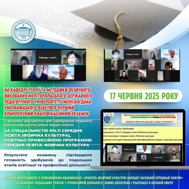 ⚽️📚 17 червня на кафедрі теорії та методики фізичного виховання Мелітопольського державного педагогічного університету імені Богдана Хмельницького відбувся перший комплексний кваліфікаційний екзамен з фахових дисциплін для здобувачів першого (бакалаврського) рівня вищої освіти за спеціальністю 014.11 Середня освіта (Фізична культура), освітньо-професійною програмою Середня освіта. Фізична культура. 👩🏻🎓🇺🇦 До складу екзаменаційної комісії увійшли провідні фахівці у сфері…