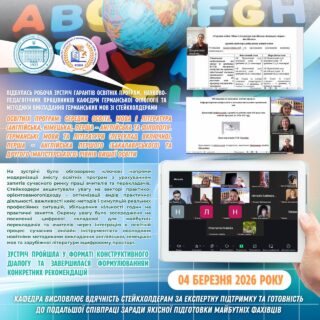 📅 4 березня 2026 року відбулась робоча зустріч гарантів освітніх програм та науково-педагогічних працівників кафедри германської філології та методики викладання германських мов зі стейкхолдерами освітніх програм «Середня освіта. Мова і література (англійська, німецька), перша – англійська» та «Філологія. Германські мови та літератури (переклад включно), перша – англійська» першого (бакалаврського) та другого (магістерського) рівнів вищої освіти.