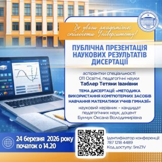 🗓 24 березня 2026 року о 14:20 відбудеться публічна презентація наукових результатів дисертації аспірантки спеціальності 011 Освітні, педагогічні науки Таблер Тетяни Іванівни, яка навчається у Мелітопольському державному педагогічному університеті імені Богдана Хмельницького.