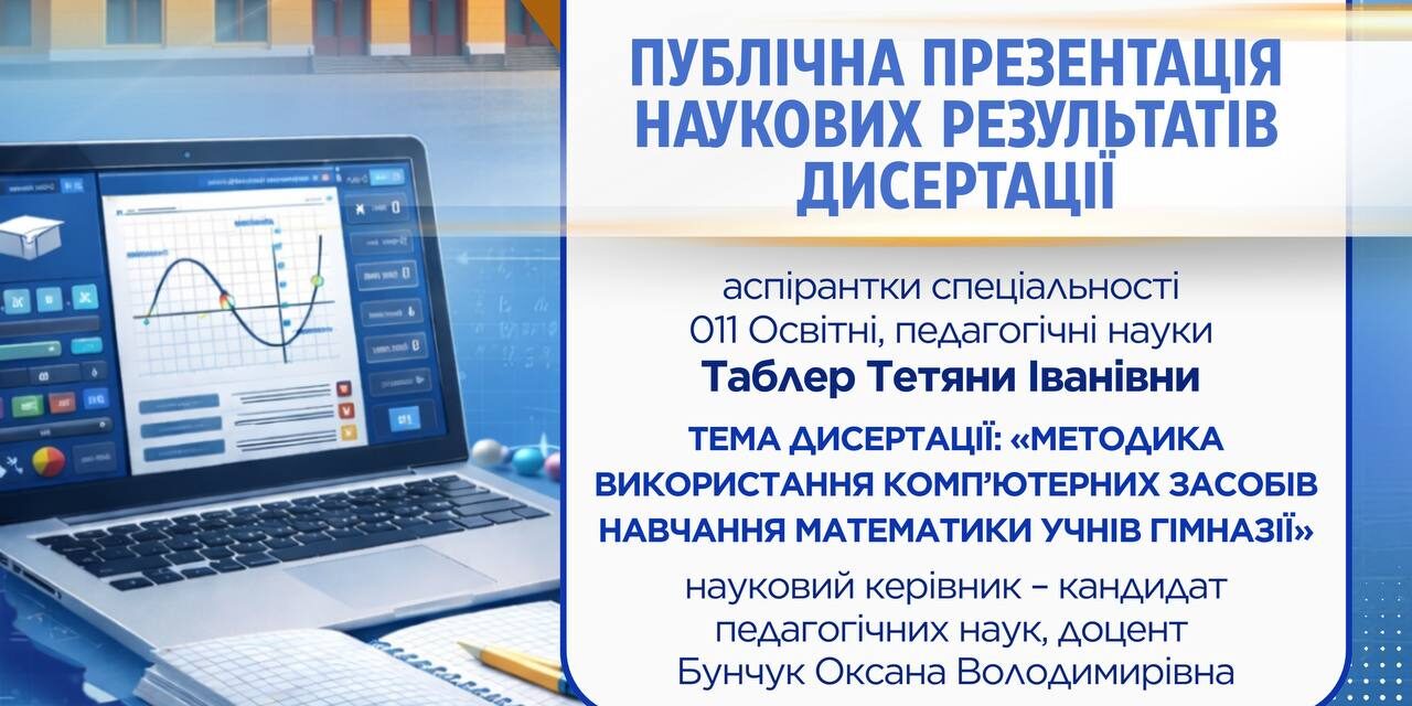 🗓 24 березня 2026 року о 14:20 відбудеться публічна презентація наукових результатів дисертації аспірантки спеціальності 011 Освітні, педагогічні науки Таблер Тетяни Іванівни, яка навчається у Мелітопольському державному педагогічному університеті імені Богдана Хмельницького.