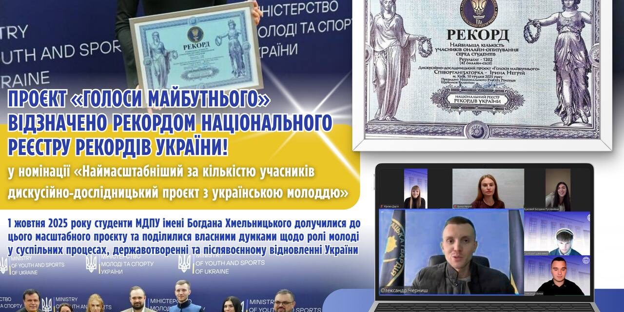 🏆🥳 За підсумками реалізації проєкт «Голоси Майбутнього» відзначено рекордом Національного реєстру рекордів України у номінації «Наймасштабніший за кількістю учасників дискусійно-дослідницький проєкт з українською молоддю» (10 грудня 2025 року).