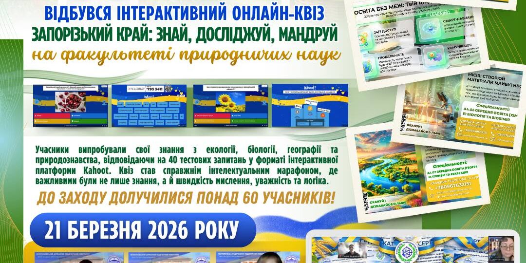 📅 21 березня 2026 року факультетом природничих наук Мелітопольського державного педагогічного університету імені Богдана Хмельницького було проведено інтерактивний еко-квіз «Запорізький край: знай, досліджуй, мандруй».