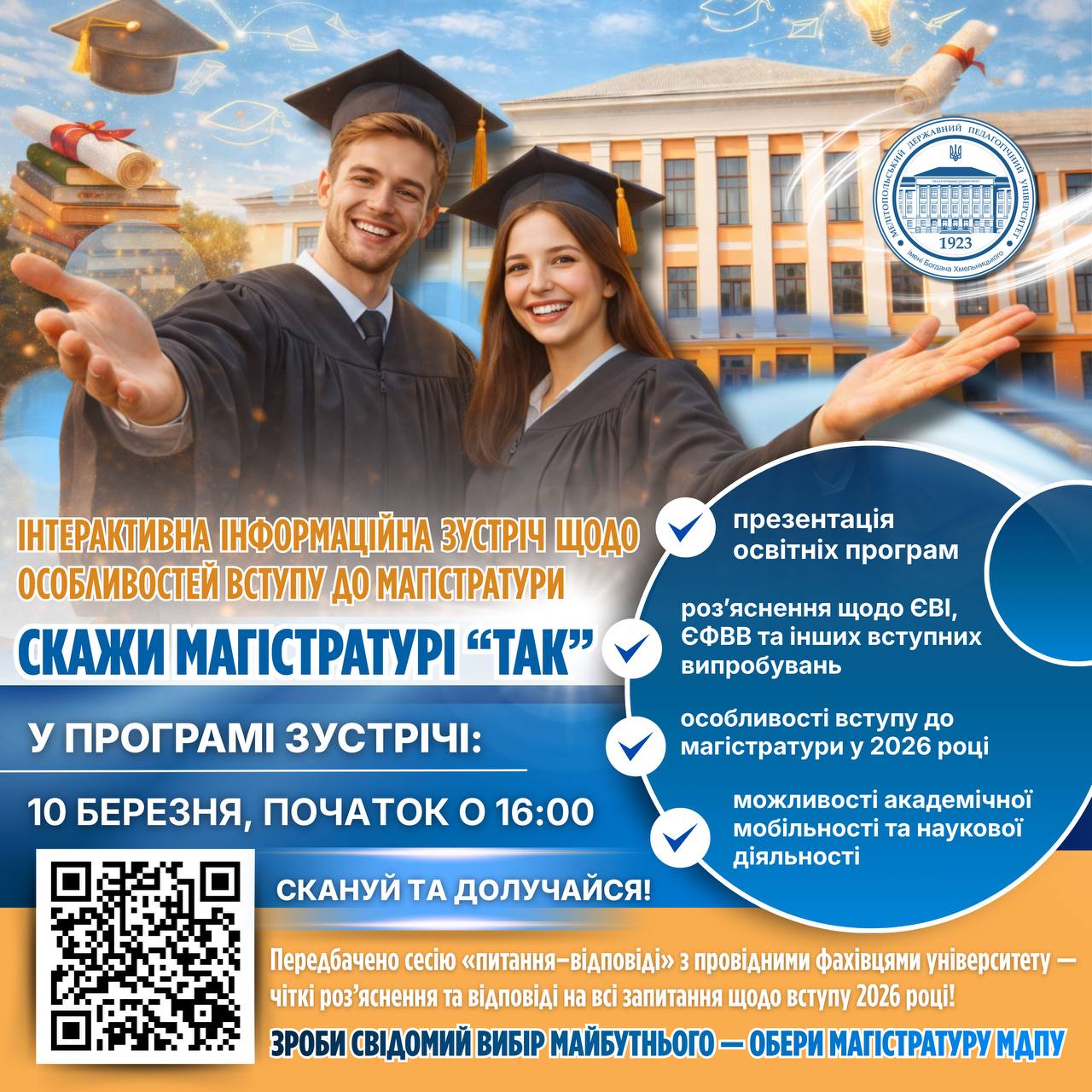 👋🏻🏛️ Агов, вступники! Мелітопольський державний педагогічний університет імені Богдана Хмельницького запрошує студентів випускних курсів та всіх, хто планує продовжити навчання, на інтерактивну інформаційну зустріч для майбутніх магістрів «СКАЖИ МАГІСТРАТУРІ “ТАК”», присвячену особливостям вступу до магістратури у 2026 році.