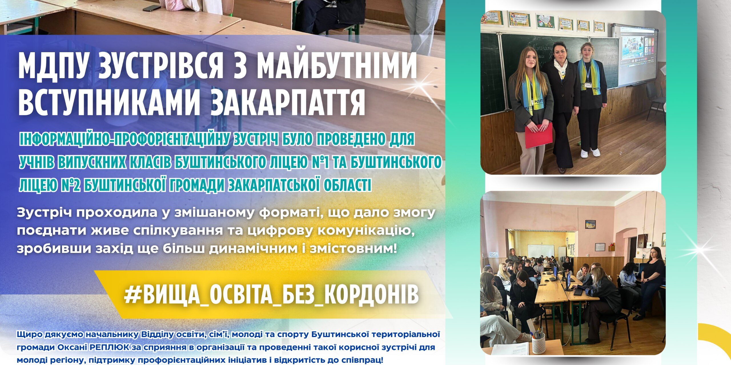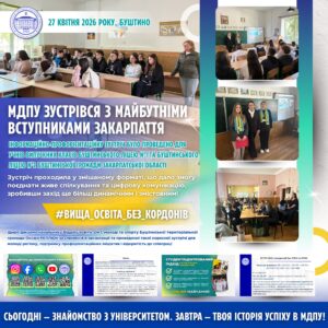 📅 27 квітня 2026 року відбулася чергова профорієнтаційна зустріч із випускниками закладів загальної середньої освіти. Цього разу на платформі Google Meet команда МДПУ імені Богдана Хмельницького презентувала переваги здобуття вищої освіти для учнів випускних класів Буштинського ліцею №1 та Буштинського ліцею №2 Буштинської громади Закарпатської області.