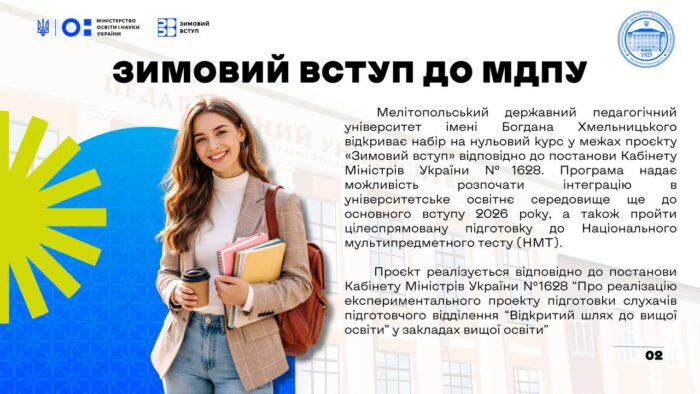 📘🎓 Відповідно до наказу Міністерства освіти і науки України від 11.02.2026 № 241 «Про внесення змін у додаток до наказу МОН України від 30.12.2025 № 1726» (https://mon.gov.ua/npa/pro-vnesennia-zmin-u-dodatok-do-nakazu-ministerstva-osvity-i-nauky-ukrainy-vid-30122025-1726), Мелітопольський державний педагогічний університет імені Богдана Хмельницького офіційно включено до Переліку закладів вищої освіти, у яких у 2026 році запроваджується підготовче відділення в межах експериментального проєкту «Відкритий шлях до вищої освіти».