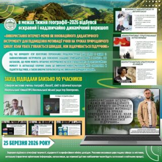 📅 25 березня 2026 року в межах Тижня географії–2026 відбувся яскравий і надзвичайно динамічний воркшоп «Використання інтернет-мемів як інноваційного дидактичного інструменту для підвищення мотивації учнів на уроках природничого циклу: коли увага з’являється швидше, ніж відкривається підручник».