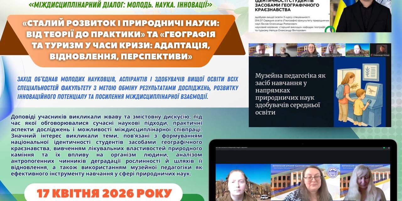 🎓📚 17 квітня 2026 року на факультеті природничих наук у рамках ІІ Міжнародної науково-практичної конференції «Міждисциплінарний діалог: Молодь. Наука. Інновації» було організовано роботу секцій «Сталий розвиток і природничі науки: від теорії до практики» та «Географія та туризм у часи кризи: адаптація, відновлення, перспективи». Учасники представили результати власних наукових досліджень, що охоплюють широкий спектр актуальних проблем сучасної науки та освіти.