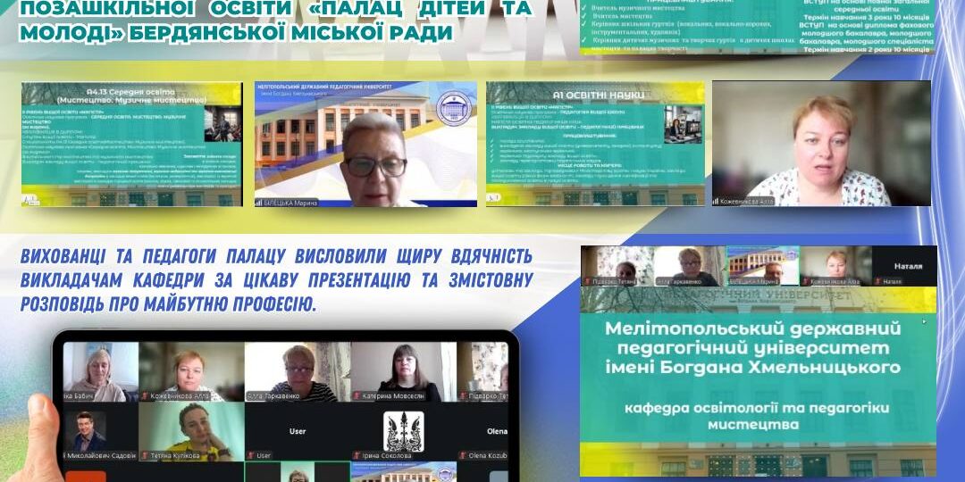 📅🤝 24 березня 2026 року викладачі кафедри освітології та педагогіки мистецтва провели профорієнтаційну зустріч із викладачами та вихованцями закладу позашкільної освіти «Палац дітей та молоді» Бердянської міської ради. Під час заходу майбутніх абітурієнтів поінформували про умови вступу та траєкторії фахової підготовки за мистецько-педагогічним профілем.