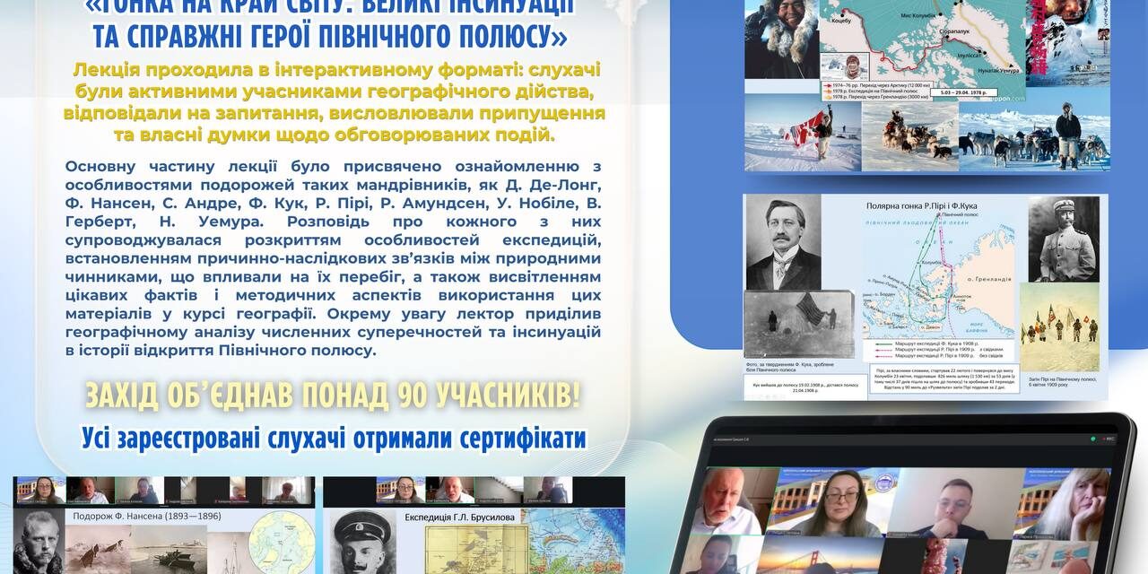 🧊 Основну частину лекції було присвячено ознайомленню з особливостями подорожей таких мандрівників, як Д. Де-Лонг, Ф. Нансен, С. Андре, Ф. Кук, Р. Пірі, Р. Амундсен, У. Нобіле, В. Герберт, Н. Уемура. Розповідь про кожного з них супроводжувалася розкриттям особливостей експедицій, встановленням причинно-наслідкових зв’язків між природними чинниками, що впливали на їх перебіг, а також висвітленням цікавих фактів і методичних аспектів використання цих матеріалів у курсі географії.