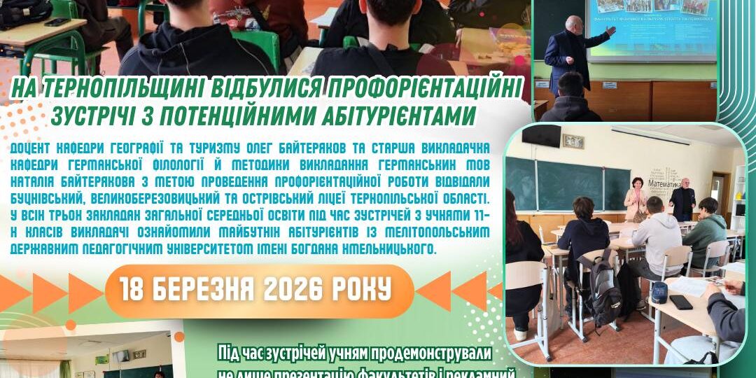 📅 18 березня 2026 року доцент кафедри географії та туризму Олег Байтеряков та старша викладачка кафедри германської філології та методики викладання германських мов Наталія Байтерякова й метою проведення профорієнтаційної роботи відвідали Буцнівський, Великоберезовицький та Острівський ліцеї Тернопільської області.