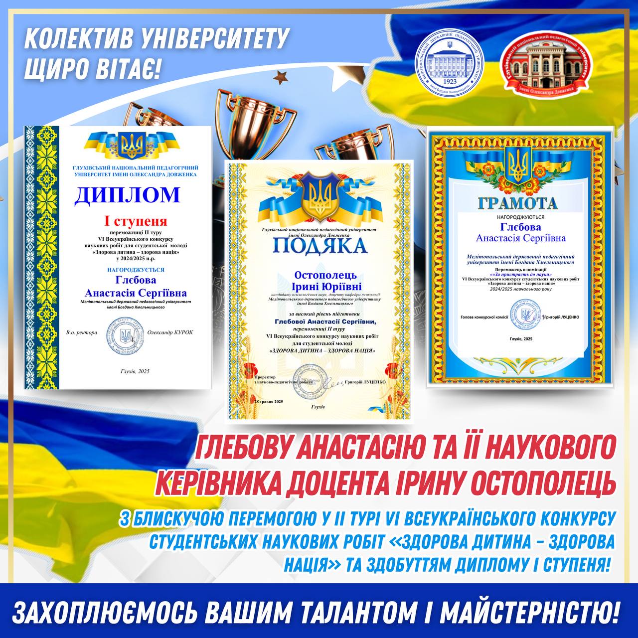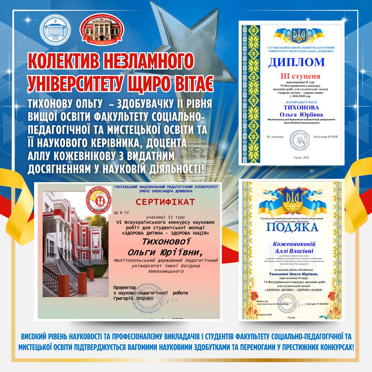 👩🏻🎓👏🏻 Колектив Мелітопольського державного педагогічного університету імені Богдана Хмельницького вітає Тихонову Ольгу Юріївну – здобувачку ІІ рівня вищої освіти (М714-сп група) факультету соціально-педагогічної та мистецької освіти – з видатним досягненням! 🥳🥉Ольга здобула ДИПЛОМ ІІІ СТУПЕНЯ та стала переможницею ІІ туру VI Всеукраїнського конкурсу наукових робіт для студентської молоді “Здорова дитина – здорова нація” у 2024/2025…