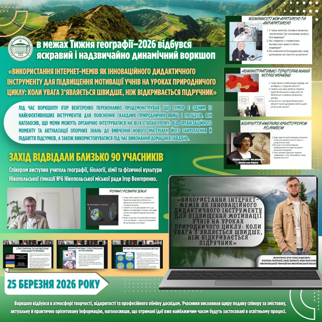📅 25 березня 2026 року в межах Тижня географії–2026 відбувся яскравий і надзвичайно динамічний воркшоп «Використання інтернет-мемів як інноваційного дидактичного інструменту для підвищення мотивації учнів на уроках природничого циклу: коли увага з’являється швидше, ніж відкривається підручник». 👨🏫 Захід провів учитель географії, біології, хімії та фізичної культури Нікопольської гімназії №6 Нікопольської міської ради Ігор Венгеренко. До…