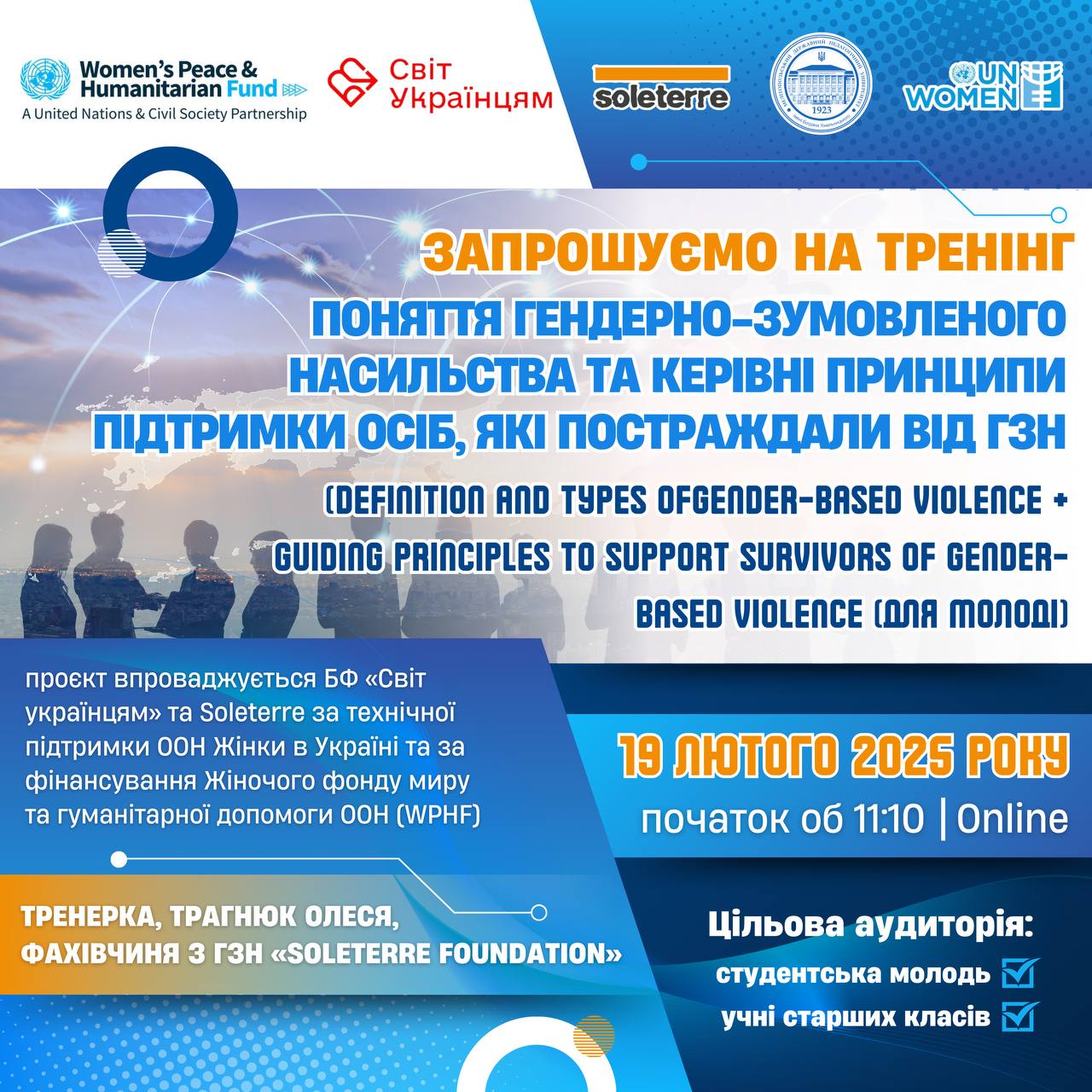💡⁉️Чи знаєш ти, що таке гендерно-зумовлене насильство (ГЗН)? Як розпізнати його прояви? Як підтримати тих, хто постраждав? ✅✊🏻 БО «БФ «Світ українцям» спільно з Фондом «Soleterre Strategie di Pace Onlus» в Україні за підтримки UN Women запрошують молодь на потужний тренінг, який змінить твій погляд на проблему ГЗН! 🎯 ДЛЯ КОГО?✅ Студенти закладів вищої освіти✅…