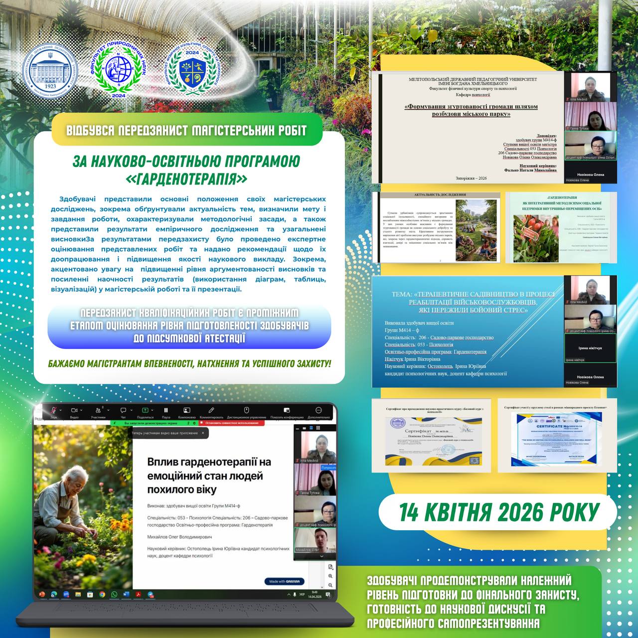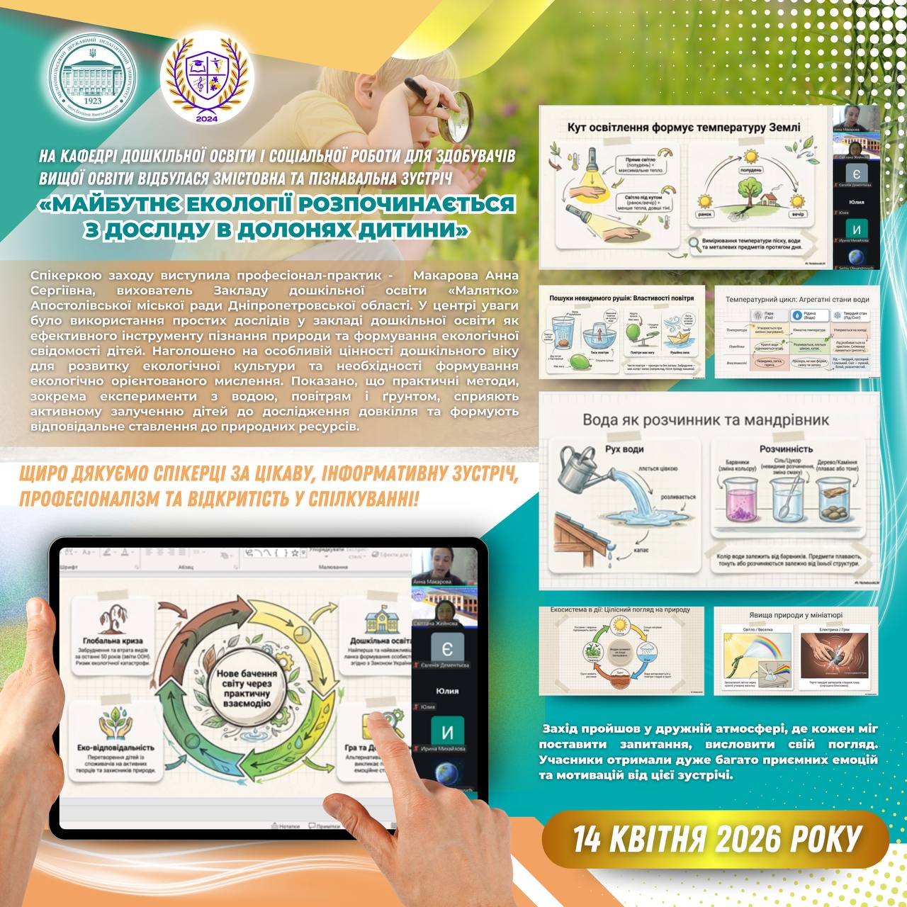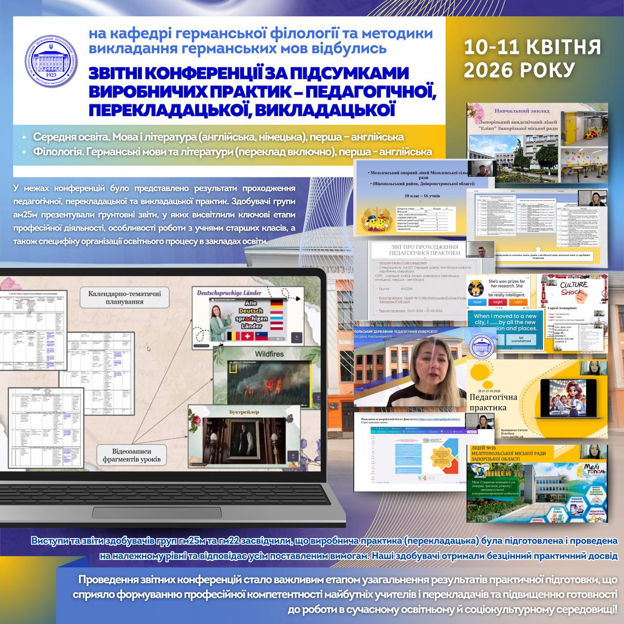 📅 15 квітня 2026 року доцентом кафедри географії та туризму Олегом Байтеряковим було проведено вебінар на тему: «Музична географія України: методика застосування музичних творів у шкільному курсі географії». Захід було організовано кафедрою географії та туризму Мелітопольського державного педагогічного університету імені Богдана Хмельницького спільно із Запорізьким обласним інститутом післядипломної педагогічної освіти. У вебінарі взяли участь понад…