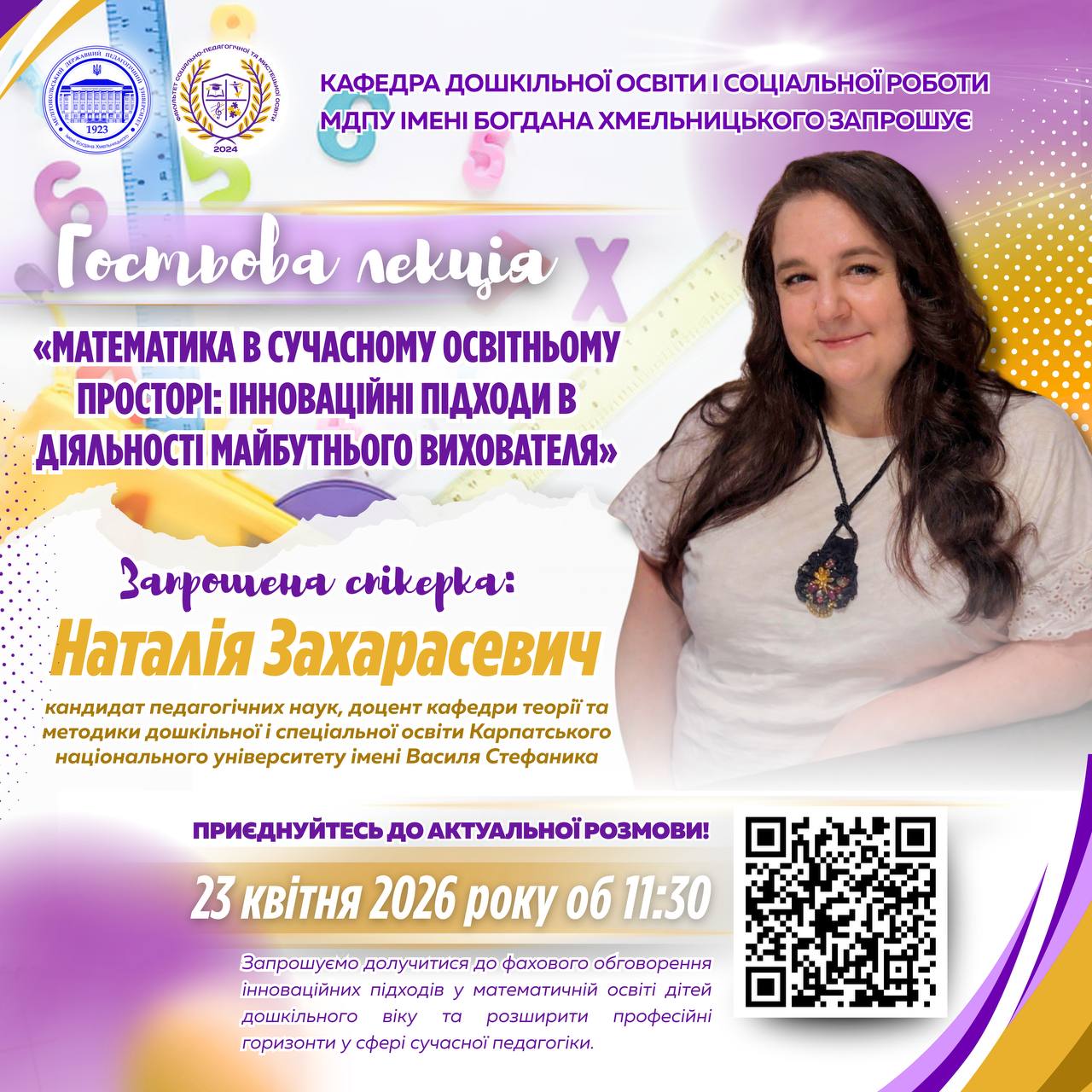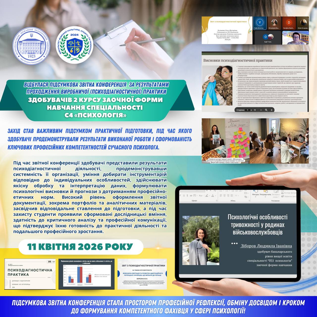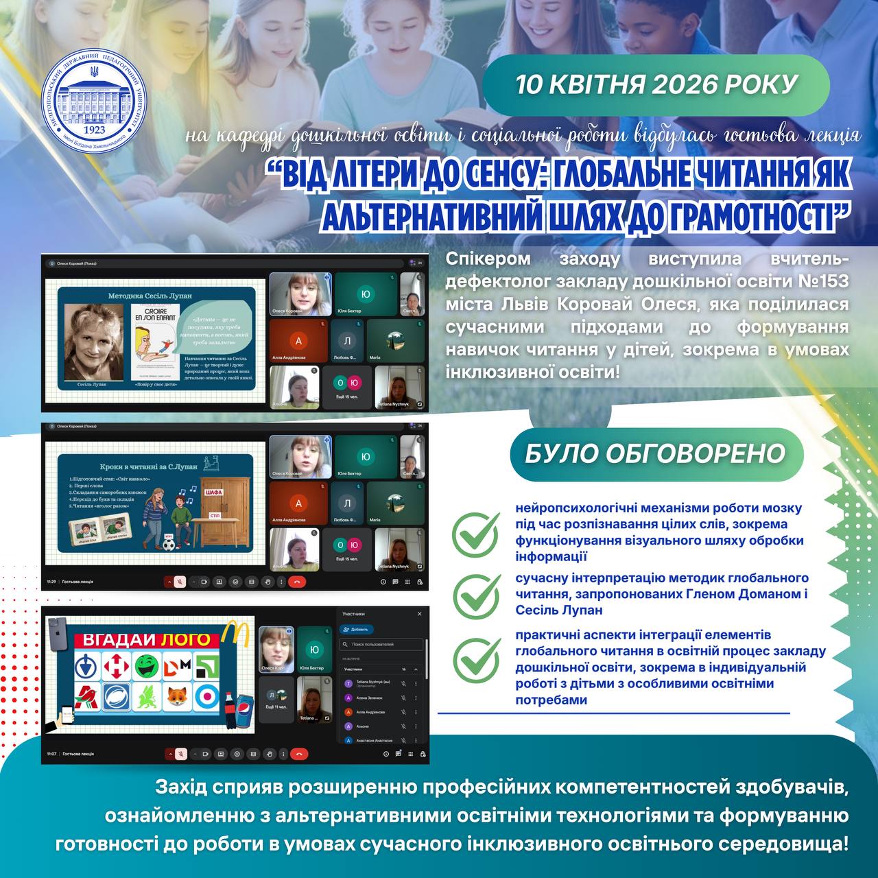 📅 15 квітня 2026 року доцентом кафедри географії та туризму Олегом Байтеряковим було проведено вебінар на тему: «Музична географія України: методика застосування музичних творів у шкільному курсі географії». Захід було організовано кафедрою географії та туризму Мелітопольського державного педагогічного університету імені Богдана Хмельницького спільно із Запорізьким обласним інститутом післядипломної педагогічної освіти. У вебінарі взяли участь понад…