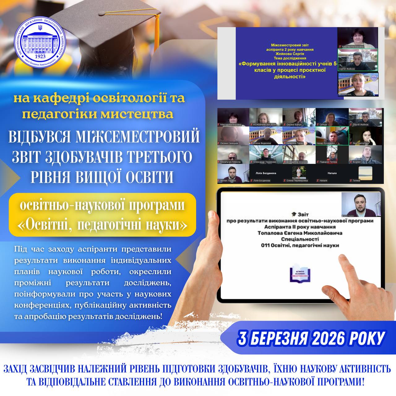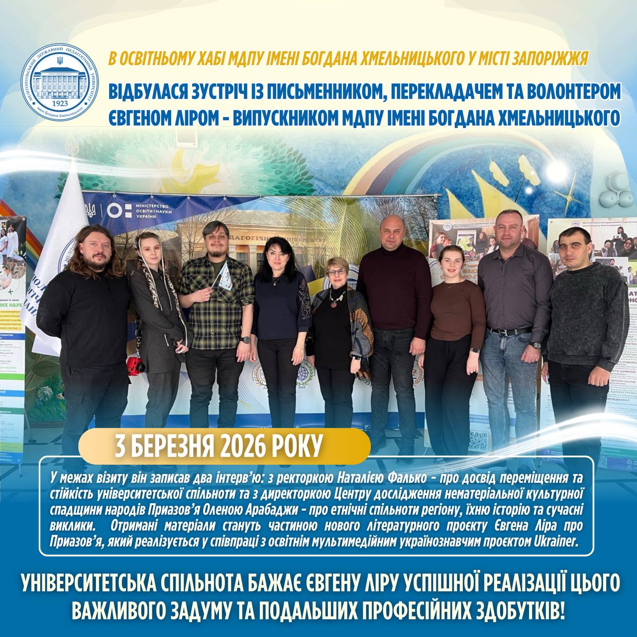 📅 3 березня в освітньому хабі університету відбулася зустріч із письменником, перекладачем та волонтером Євгеном Ліром — випускником МДПУ імені Богдана Хмельницького. У 2018 році він з відзнакою завершив навчання на філологічному факультеті за спеціальністю «Германські мови (переклад включно)». 📖 Під час зустрічі Євген представив основні напрями своєї літературної та перекладацької діяльності, зокрема роботу над…