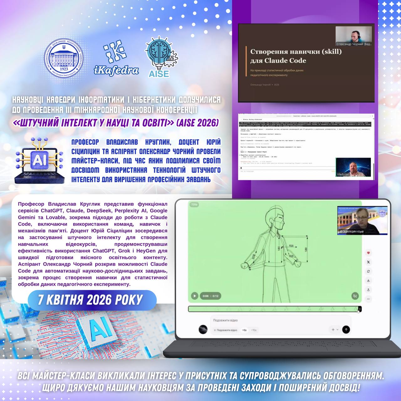 📅 7 квітня 2026 року науковці кафедри інформатики і кібернетики долучилися до проведення ІІІ Міжнародної наукової конференції «Штучний інтелект у науці та освіті» (AISE 2026). Професор Владислав КРУГЛИК, доцент Юрій СІЦИЛІЦИН та аспірант Олександр ЧОРНИЙ провели майстер-класи, під час яких поділилися своїм досвідом використання технологій штучного інтелекту для вирішення професійних завдань. 💡 Професор Владислав КРУГЛИК…
