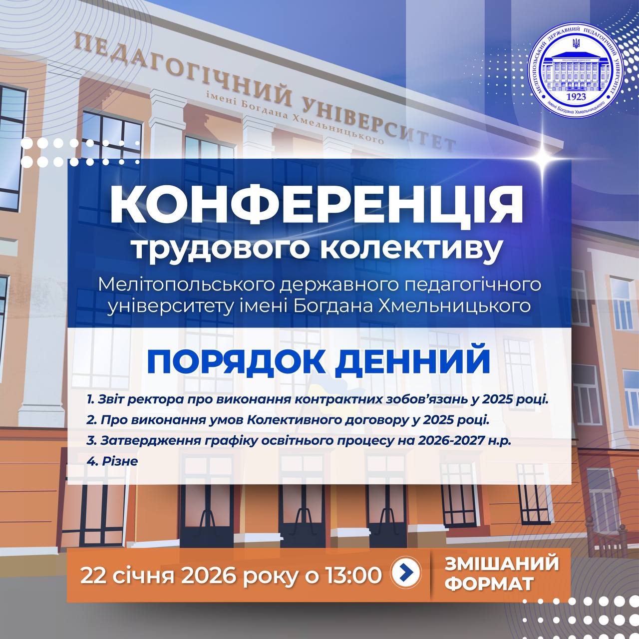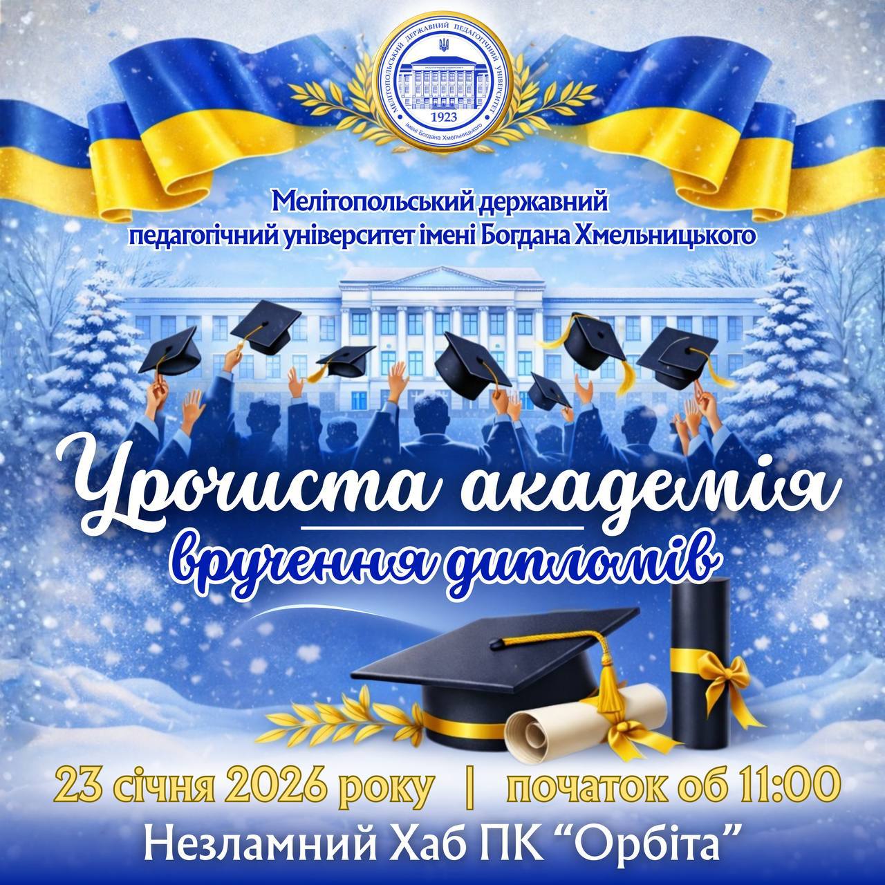 💫🏛️Є події, які не просто з’являються в календарі — вони закарбовуються в пам’яті назавжди. 🥳👥 23 січня 2026 року саме таким стане день Урочистої академії вручення дипломів випускникам магістратури МДПУ імені Богдана Хмельницького! 👨🏼🎓👏🏻 Це буде більше, ніж церемонія. Це буде мить тріумфу покоління, яке навчалося в час випробувань і зробило свідомий вибір — залишатися…