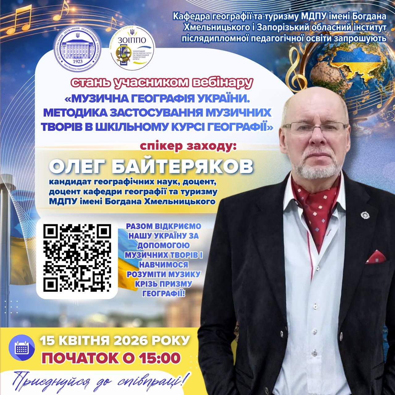 🏛🇺🇦 Кафедра географії та туризму Мелітопольського державного педагогічного університету імені Богдана Хмельницького спільно із Запорізьким обласним інститутом післядипломної педагогічної освіти запрошує стати учасником вебінару, присвяченого інтеграції музичного мистецтва у викладання географії. 📚 Тема вебінару: «Музична географія України. Методика застосування музичних творів в шкільному курсі географії» 👨🏫 Спікер заходу: Байтеряков Олег Зуфарович — кандидат географічних наук,…