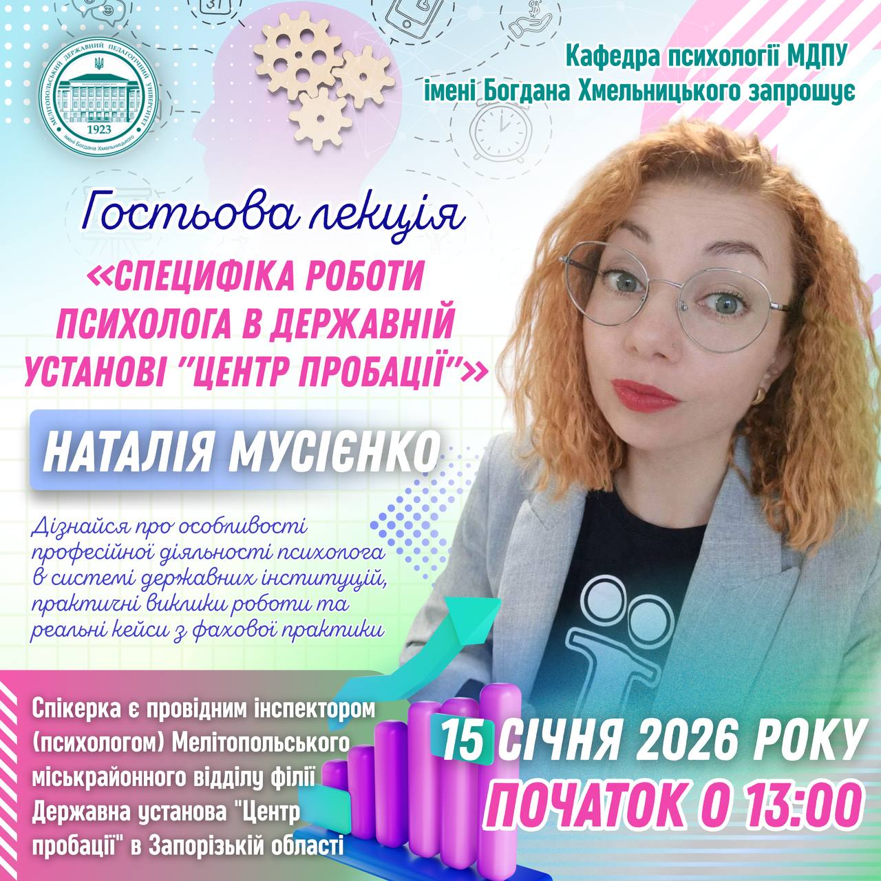 Details📖✨ Кафедра психології запрошує на змістовну та надзвичайно актуальну подію, що відкриє реальний вимір професійної діяльності психолога у системі кримінальної юстиції та соціальної реабілітації. 🧩💬 Гостьова лекція:«Специфіка роботи психолога в Державній установі “Центр пробації”» 🎤👩🏻⚕️ Спікерка:Мусієнко Наталія Юріївна — провідний інспектор (психолог) Мелітопольського міськрайонного відділу філії Державна установа «Центр пробації» в Запорізькій області, практик із…
