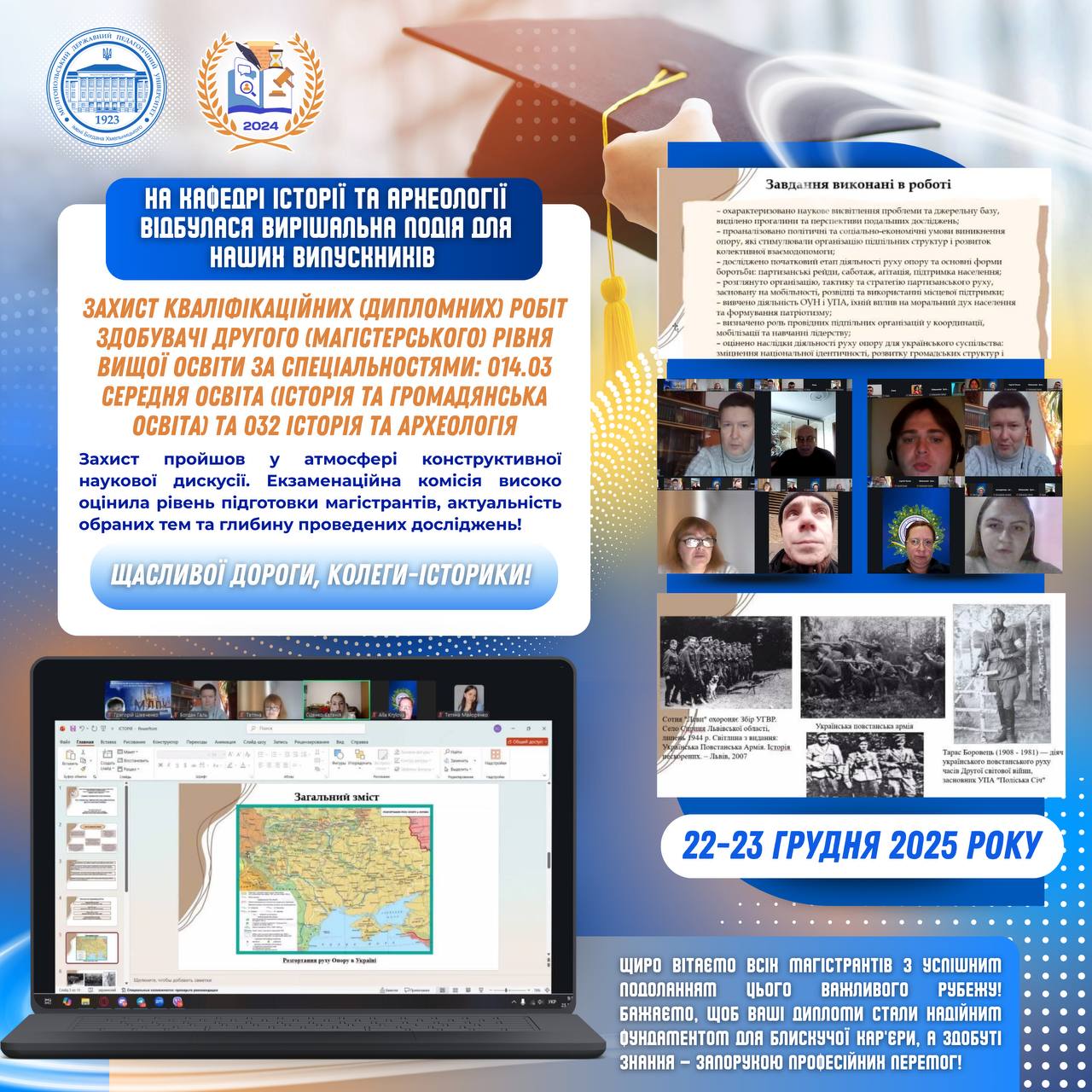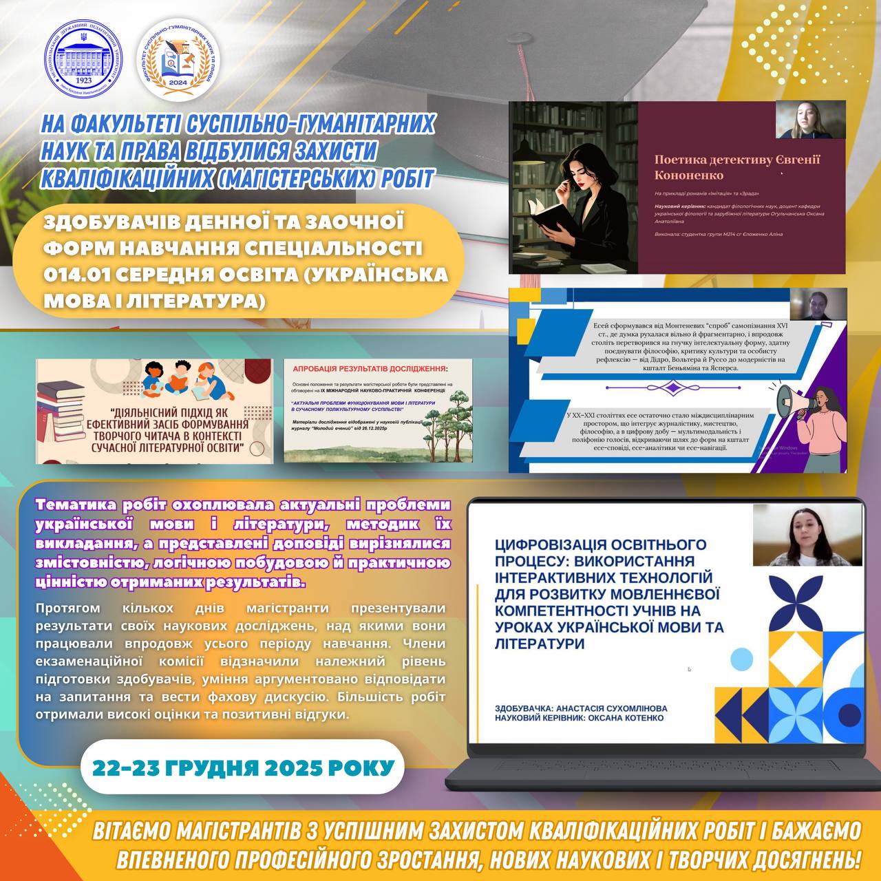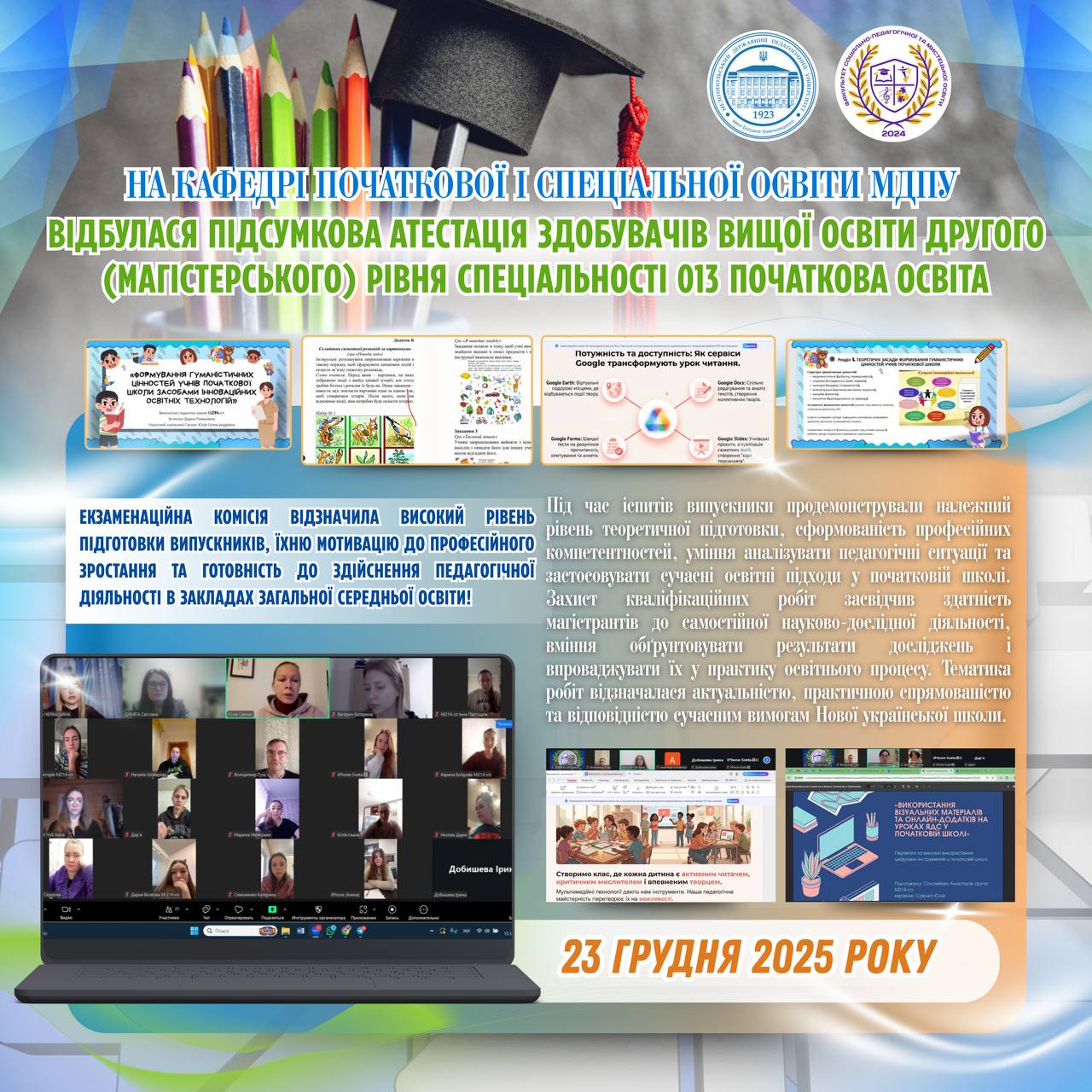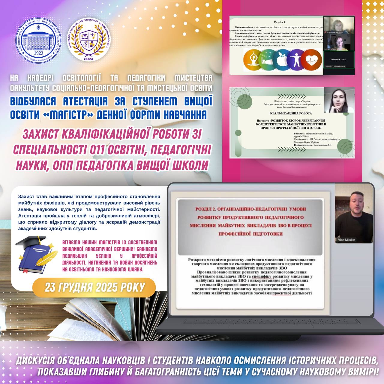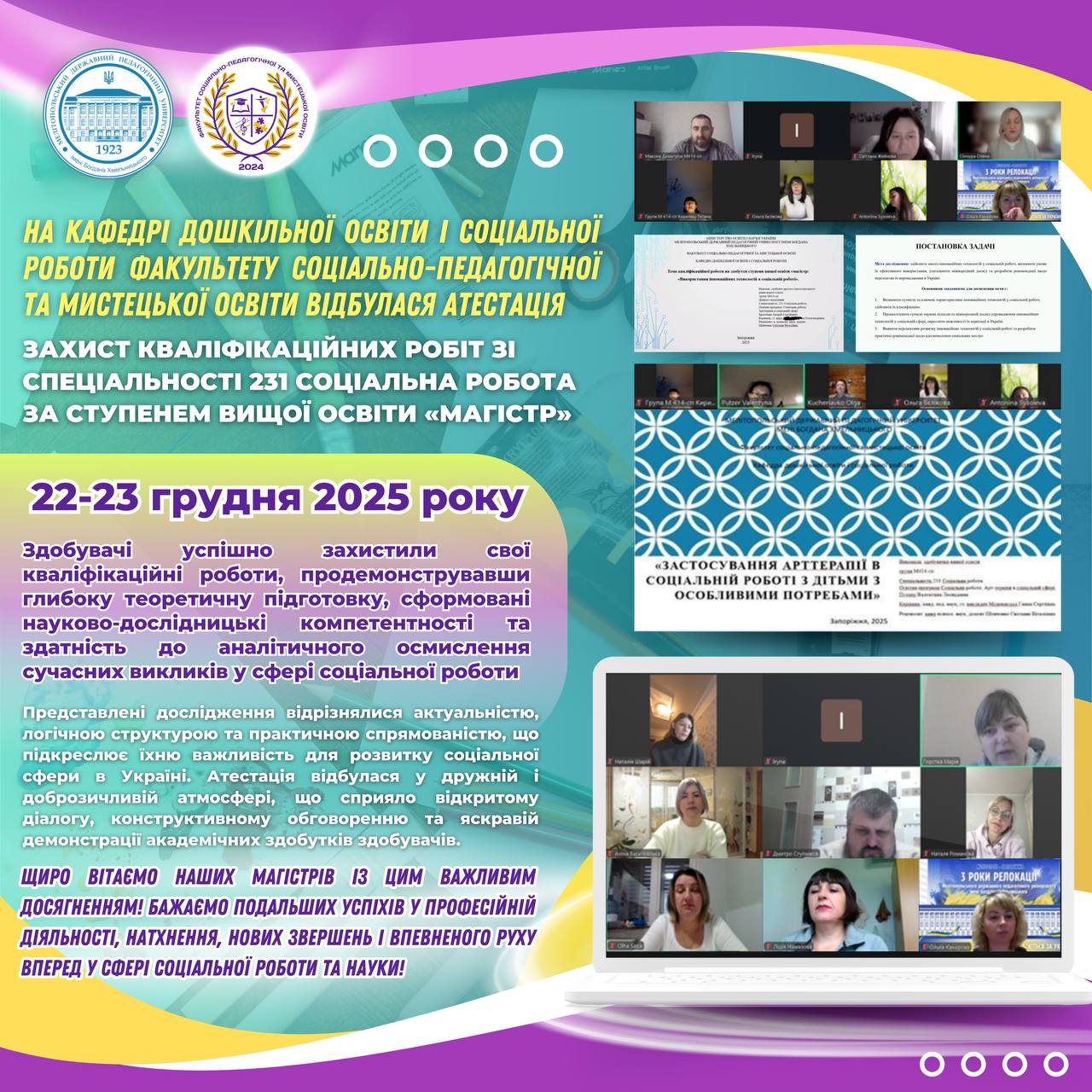 📅 22–23 грудня 2025 року на кафедрі дошкільної освіти і соціальної роботи факультету соціально-педагогічної та мистецької освітиМелітопольський державний педагогічний університет імені Богдана Хмельницькоговідбулася атестація за ступенем вищої освіти «Магістр» здобувачів груп М414-сп та ср 24М денної та заочної форм навчання — захист кваліфікаційних робіт зі спеціальності 231 Соціальна робота (ОПП Соціальна робота. Арт-терапія в соціальній…