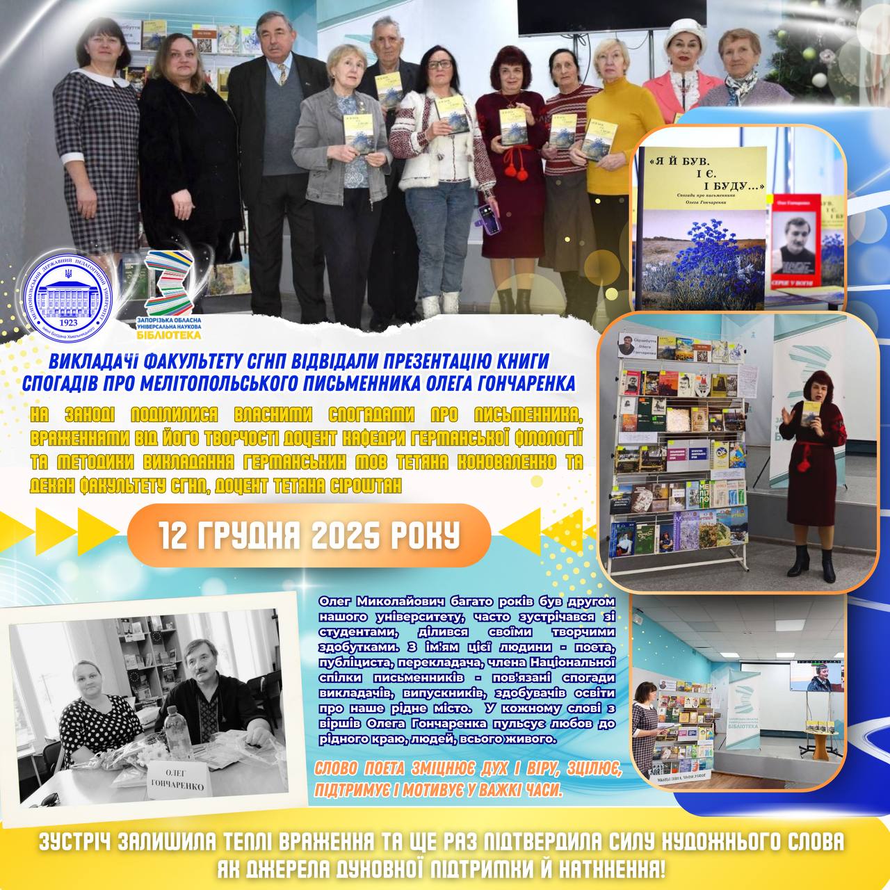 📚 12 грудня 2025 року викладачі факультету СГНП відвідали презентацію книги спогадів про мелітопольського письменника Олега Гончаренка, що відбулася у Запорізькій обласній науковій бібліотеці — подію щиру, світлу й глибоко зворушливу. 🕊 Олег Миколайович був не просто знаним поетом, публіцистом, перекладачем, членом Національної спілки письменників України — він багато років залишався другом нашого університету, людиною,…