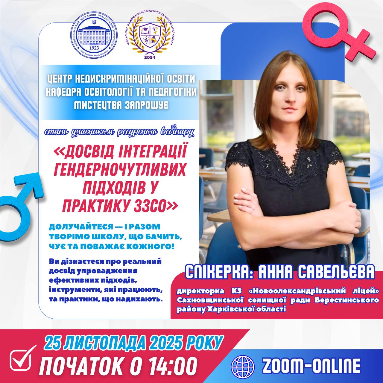 👥✅ Центр недискримінаційної освіти, кафедра освітології та педагогіки мистецтвазапрошує на вебінар: «ДОСВІД ІНТЕГРАЦІЇ ГЕНДЕРНОЧУТЛИВИХ ПІДХОДІВ У ПРАКТИКУ ЗЗСО» 👩🏼🏫⭐️ Спікерка: АННА САВЕЛЬЄВА — директорка КЗ «Новоолександрівський ліцей» Сахновщинської селищної ради Берестинського району Харківської області, фахівчиня, яка впевнено впроваджує гендерночутливу освіту у щоденну шкільну практику. 📅 Дата: 25 листопада 2025 року ⏰ Час: 14:00🔗 Приєднатися до…
