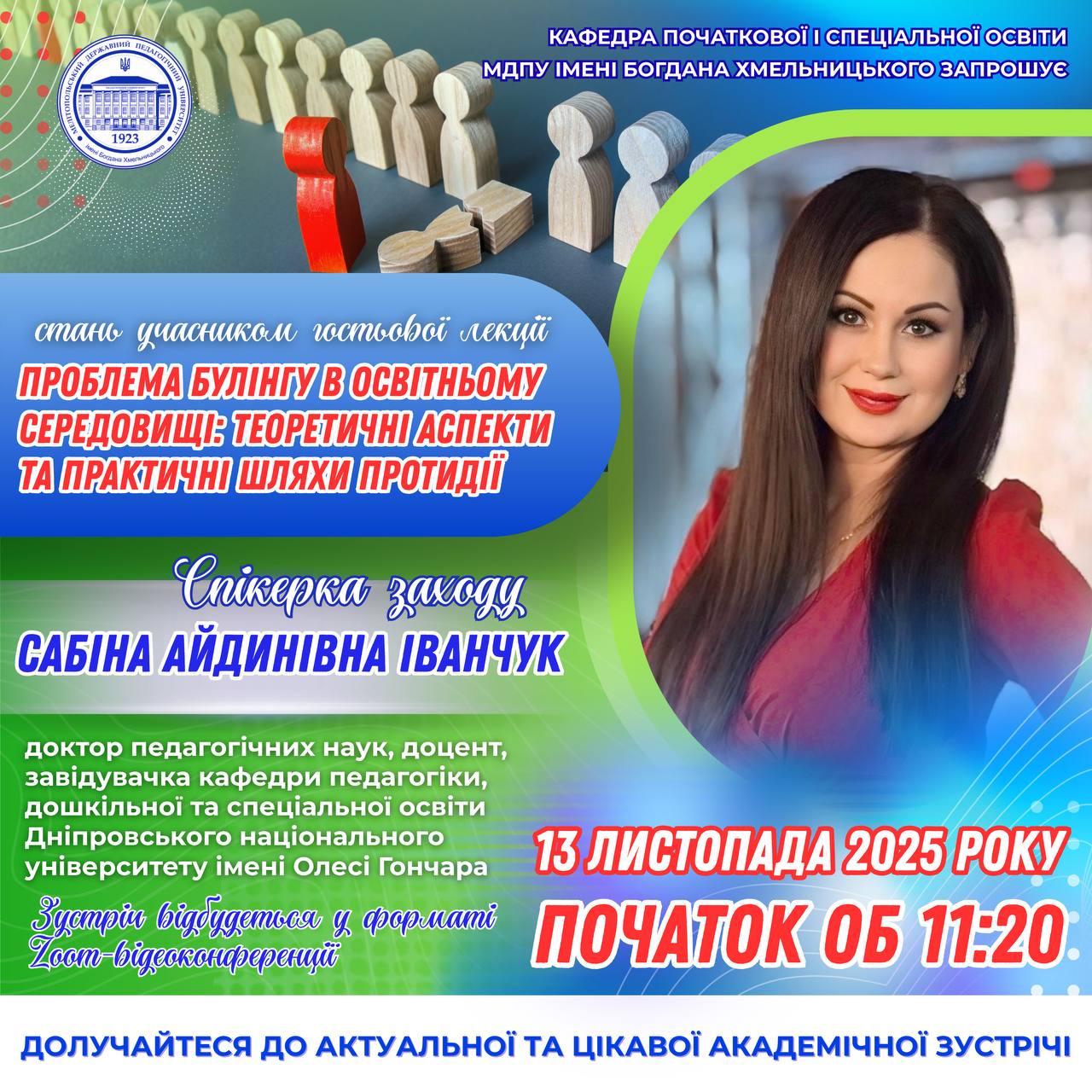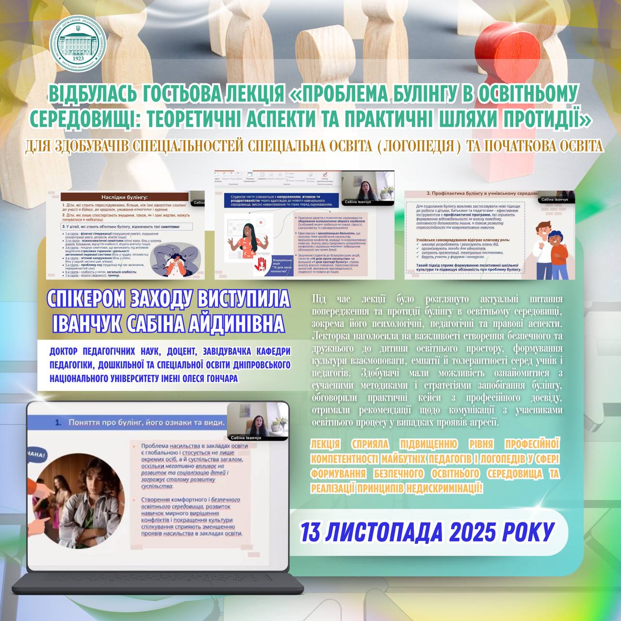 🇺🇦👩🏼🏫13 листопада 2025 року для здобувачів спеціальностей «Спеціальна освіта (Логопедія)» та «Початкова освіта» відбулася гостьова лекція на тему «Проблема булінгу в освітньому середовищі: теоретичні аспекти та практичні шляхи протидії». 👩🏼🎓👏🏻Спікером заходу виступила Іванчук Сабіна Айдинівна, доктор педагогічних наук, доцент, завідувачка кафедри педагогіки, дошкільної та спеціальної освіти Дніпровського національного університету імені Олеся Гончара. 📚✊🏻Під час лекції…