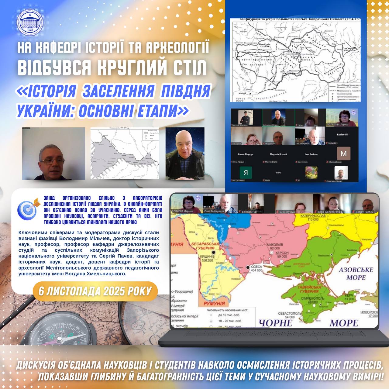 🏛👏🏻6 листопада 2025 року за запрошенням спільноти студентів-археологів «Арте по факту» та доцента кафедри історії України, археології та спеціальних галузей історичних наук Богдана Строцень доцентом кафедри географії та туризму МДПУ імені Богдана Хмельницького Олегом Байтеряковим і мелітопольським письменником Євгеном Ліром було проведено онлайн-лекцію на тему: ⛰🍒«Дорога на Південь: Кам’яна Могила та інші дивовижі Приазов’я». 👥✅У…