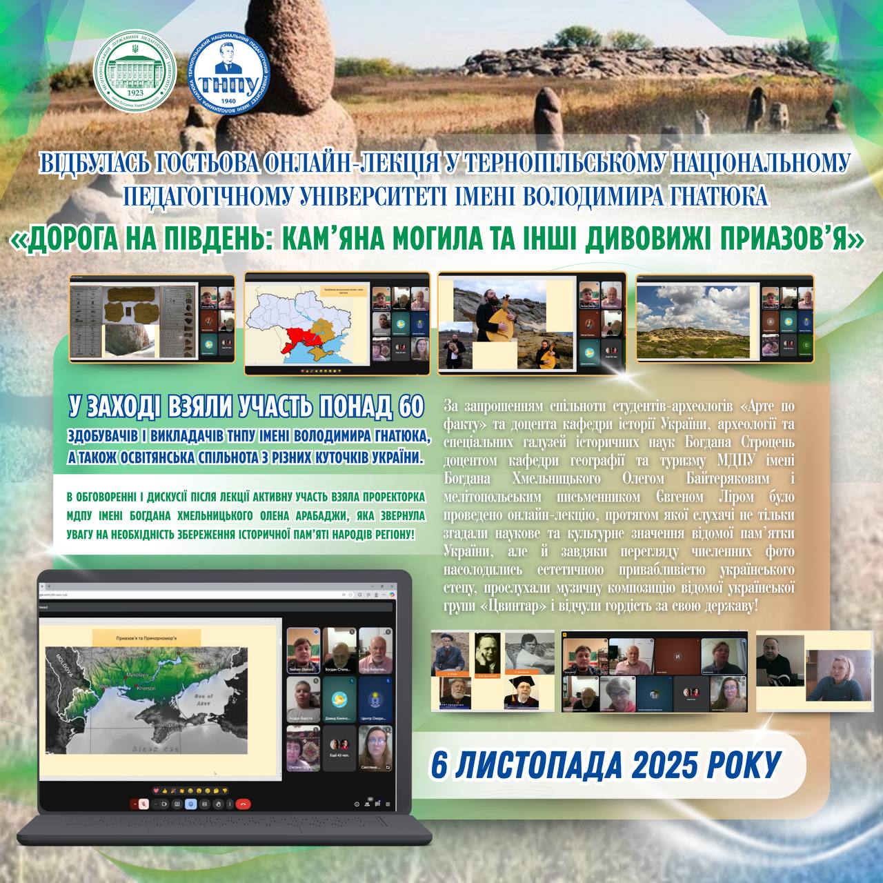 ГОСТЬОВА ОНЛАЙН-ЛЕКЦІЯ «ДОРОГА НА ПІВДЕНЬ:КАМ’ЯНА МОГИЛА ТА ІНШІ ДИВОВИЖІ ПРИАЗОВ’Я» У ТЕРНОПІЛЬСЬКОМУ НАЦІОНАЛЬНОМУПЕДАГОГІЧНОМУ УНІВЕРСИТЕТІ ІМЕНІ ВОЛОДИМИРА ГНАТЮКА