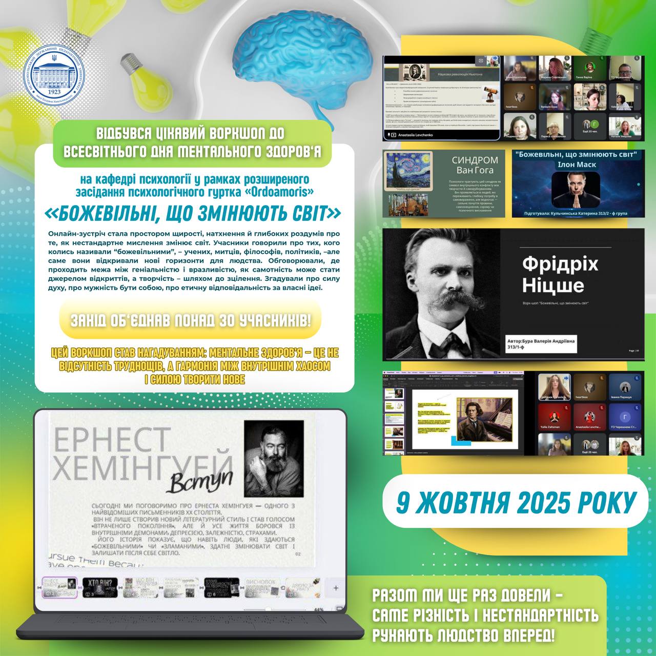 🧠🙏🏼 Напередодні Всесвітнього дня ментального здоров’я відбулося розширене засідання психологічного гуртка «Ordo amoris» кафедри психології. 👥🔥Воркшоп «Божевільні, що змінюють світ» об’єднав понад 30 учасників! 💬📚Онлайн-зустріч стала простором щирості, натхнення й глибоких роздумів про те, як нестандартне мислення змінює світ. 🎨👏🏻Ми говорили про тих, кого колись називали “божевільними” — учених, митців, філософів, політиків, — але саме…
